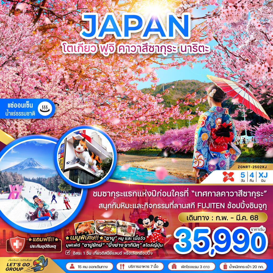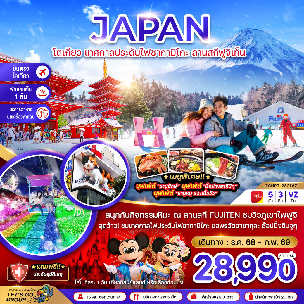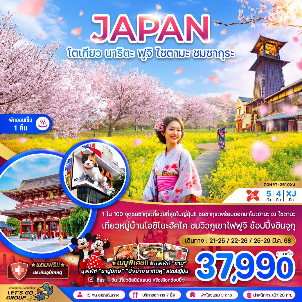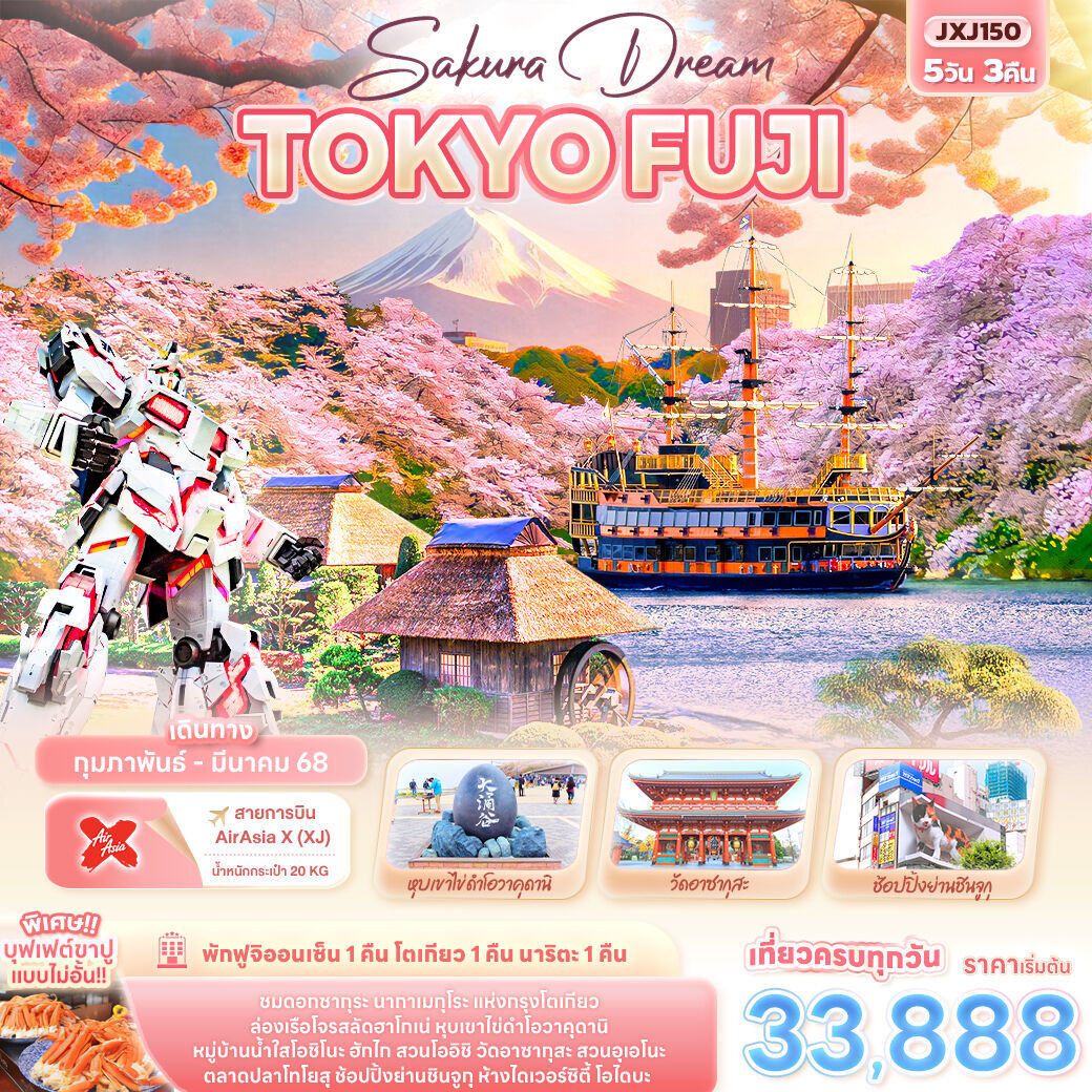 สถานที่ท่องเที่ยว : วัดอาซากุซะ วัดที่เก่าแก่ที่สุดในกรุงโตเกียว หุบเขาโอวาคุดานิ ชิมไข่ดำ ภูเขาไฟฟูจิ เป็นภูเขาที่สูงที่สุดในญี่ปุ่น โตเกียวสกายทรีหอส่งสัญญาณโทรคมนาคมที่สูงที่สุดในโลก  ทะเลสาบคาวากูจิโกะ  ลานสกีฟูจิเท็น  หมู่บ้านโอชิโนะฮักไกแหล่งนํ้าตามธรรมชาติ  หมู่บ้านเยอรมันแห่งโตเกียว  โตเกียวดิสนีย์แลนด์  ชมดอกซากุระบาน
