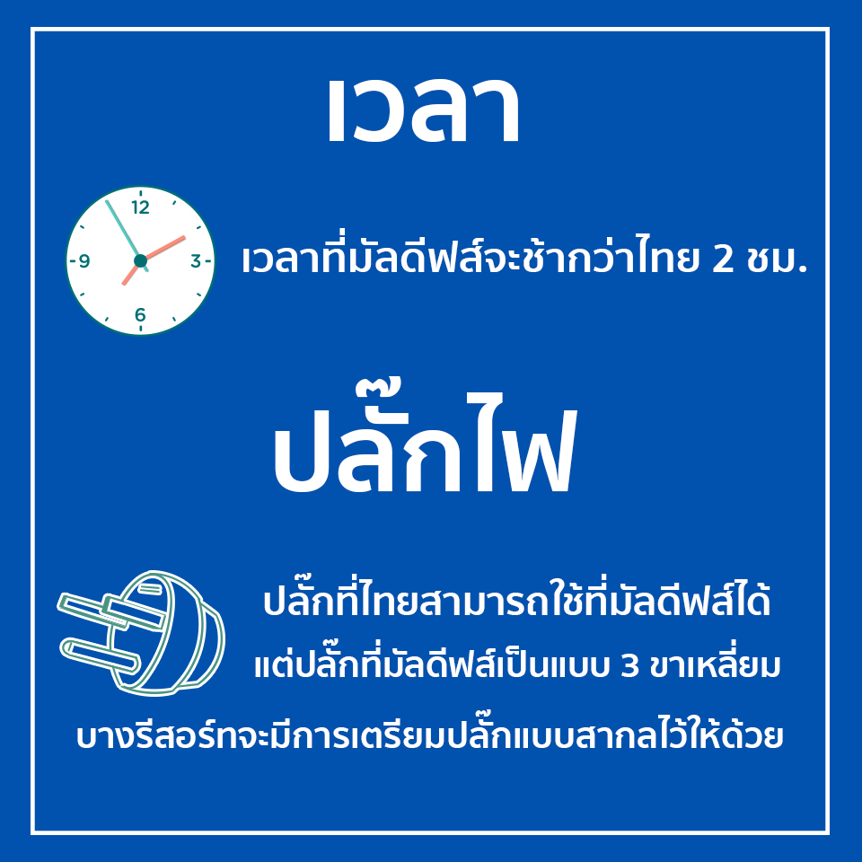 เวลาของประเทศมัลดีฟส์จะช้ากว่ากับประเทศไทย 2 ชม. และระบบไฟฟ้าเป็นแบบ 220-240 โวลต์ เครื่องใช้ไฟฟ้าในเมืองไทยสามารถนำไปใช้ที่มัลดีฟส์ได้ แต่ปลั๊กที่มัลดีฟส์ เป็นแบบ 3 ขาเหลี่ยม ส่วนใหญ่ที่รีสอร์ทจะมีหัวปลั๊กที่ใช้ได้กับหัวปลั๊กทั่วโลกอยู่ในห้องพักอยู่แล้ว