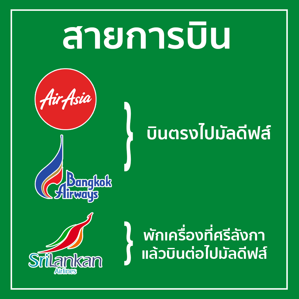 สายการบินที่ไปมัลดีฟส์มี 3 สายการบิน โดยมี Air Asia และ Bangkok Airways เป็นสายการบินที่บินตรงไปมัลดีฟส์ ส่วนอีกสายการบินคือ Srilankan Airlines โดยสายการบินนี้จะพักเครื่องที่ศรีลังกาและบินต่อไปที่มัลดีฟส์
