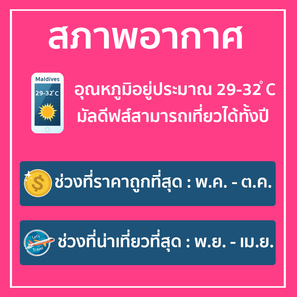มัลดีฟส์จะมี 2 ฤดู มรสุมใน 1 ปี : มรสุมทางทิศเหนือ - ตะวันออกหรือ Ruvai จะเป็นช่วงเดือนธันวาคม - มีนาคม ซึ่งเป็นช่วงที่ค่อนข้างแห้งแล้ง อีกมรสุมคือทางทิศใต้ - ตะวันตก หรือ Ulhangu ซึ่งจะเป็นช่วงเดือนเมษายน-พฤศจิกายน และจะมีฝนบ้างบางครั้ง แต่ตกไม่เกินครึ่งชม. อุณหภูมิในตอนกลางวันจะอยู่ที่ประมาณ 29 องศาเซลเซียส ( 82 องศาฟาเรนไฮต์ ) ตลอดทั้งปี ความชื้นจะมีน้อยกว่าในช่วงหน้าแล้ง แต่ตลอดทั้งวันจะมีลมทะเลพัดเย็นสบาย