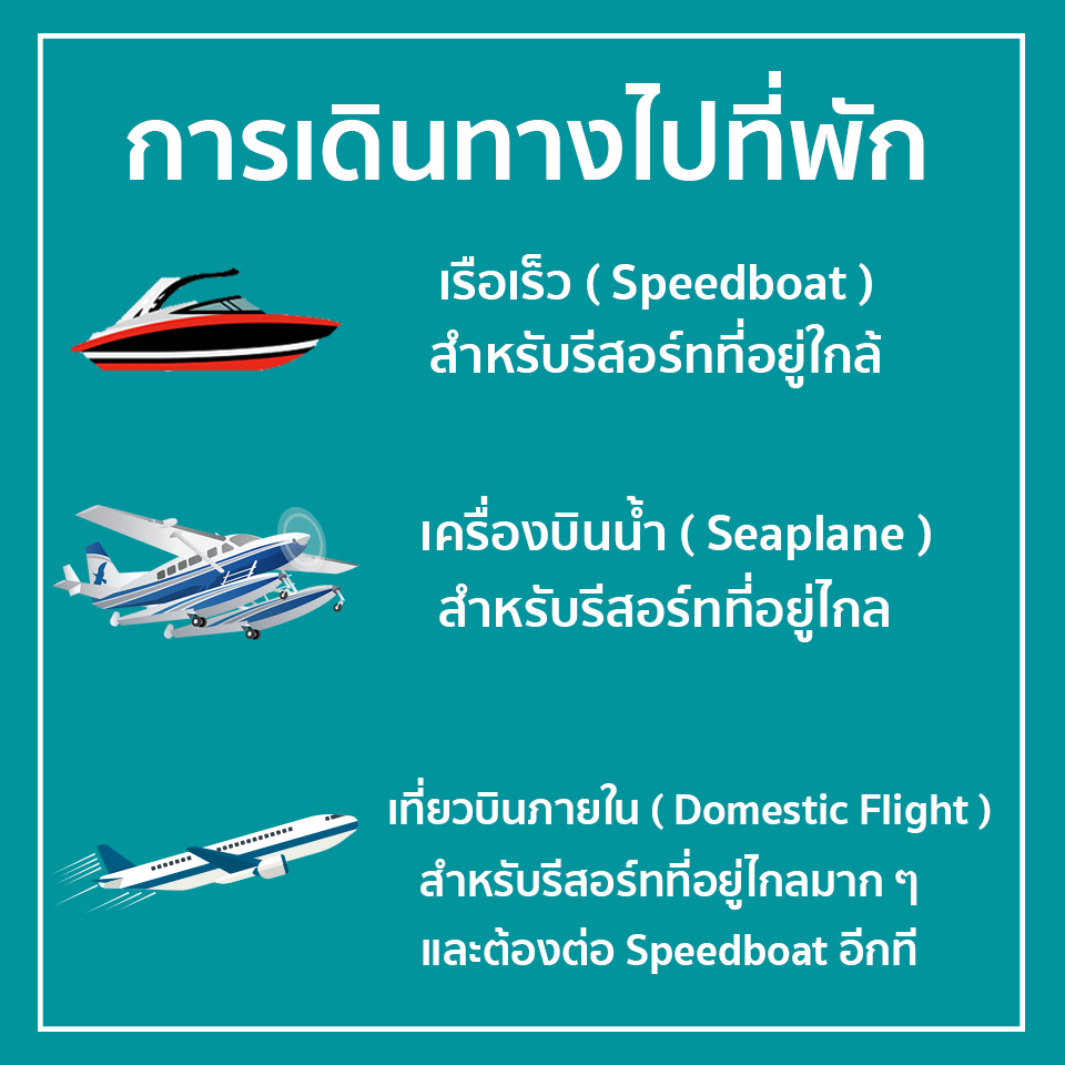 การเดินทางไปยังที่พัก หลังจากที่ลงเครื่องที่สนามบินสามารถไปติดต่อเค้าเตอร์รีสอร์ทที่เราทำการจองไว้โดยแต่ล่ะรีสอร์ทจะเดินทางไม่เหมือนกัน ถ้าเป็นรีสอร์ทที่ใกล้สนามบินจะเดินทางโดย Speedboat ใช้เวลาประมาณไม่เกินครึ่งชม. ถ้าเป็นรีสอร์ทที่ไกลออกไปอีกจะเดินทางโดย Seaplane ใช้เวลาประมาณชม.ขึ้นไป แต่ถ้าเป็นรีสอร์ทที่ไกลมาก ๆ จะเดินทางโดย Domestic flight และต่อ Speedboat อีกที