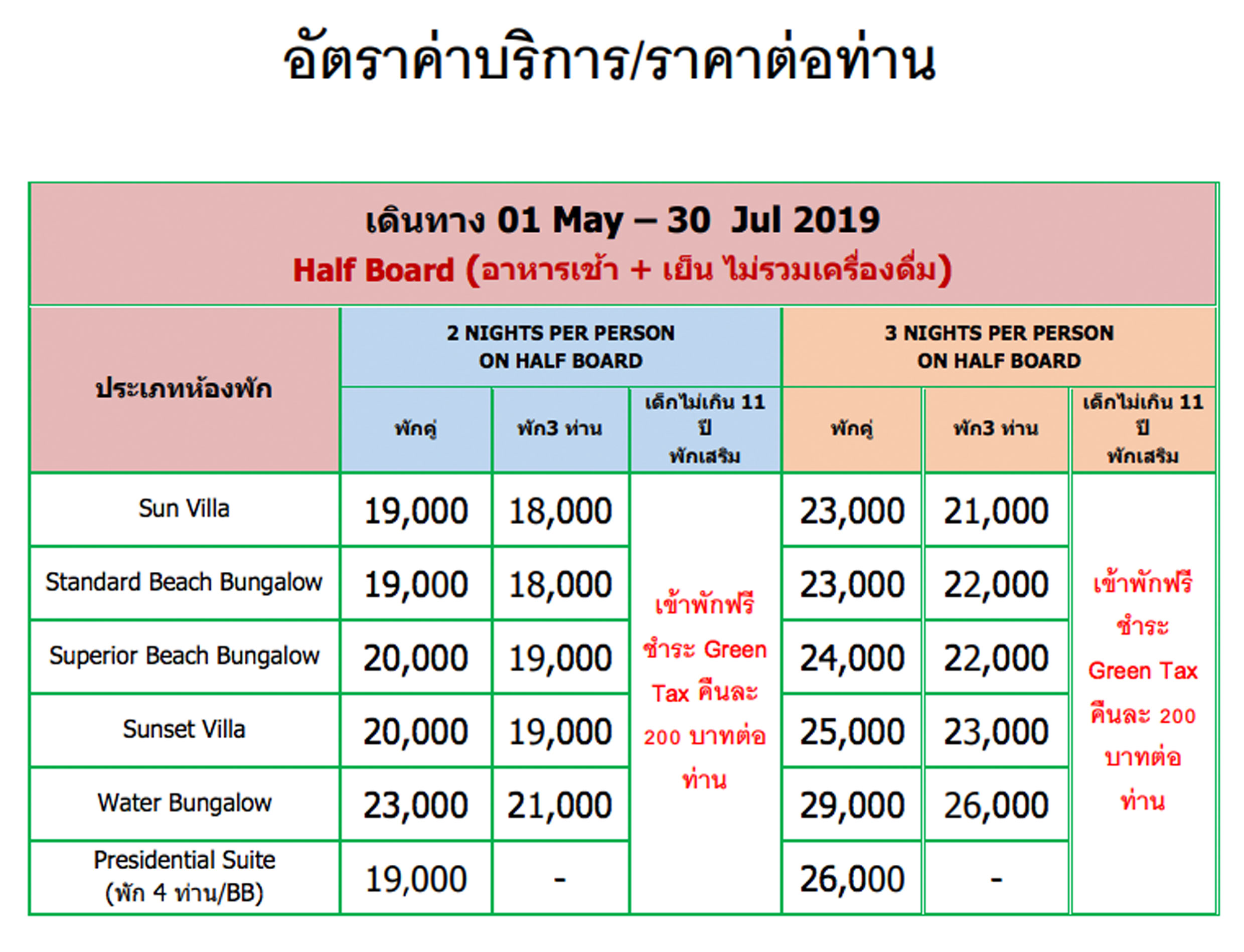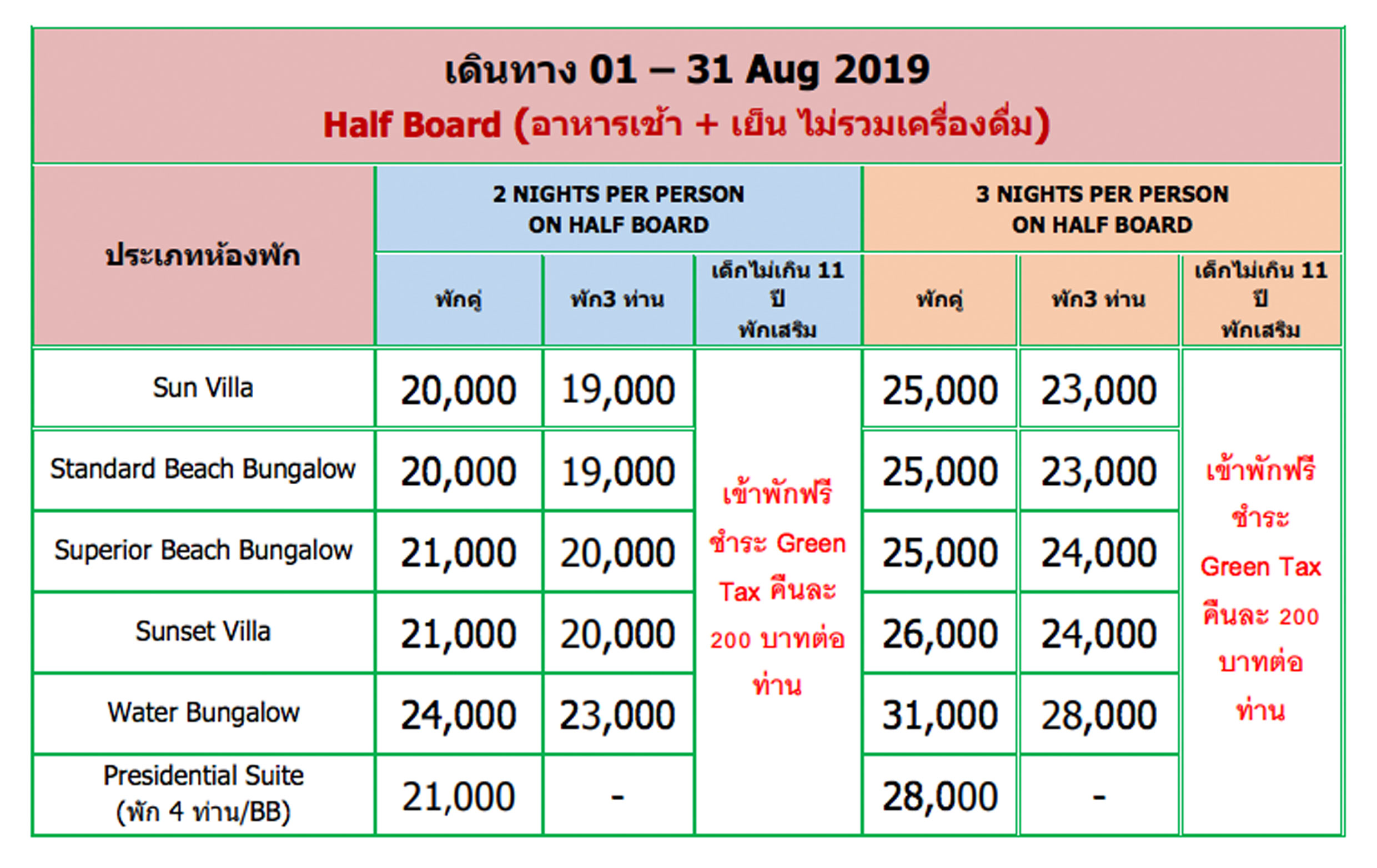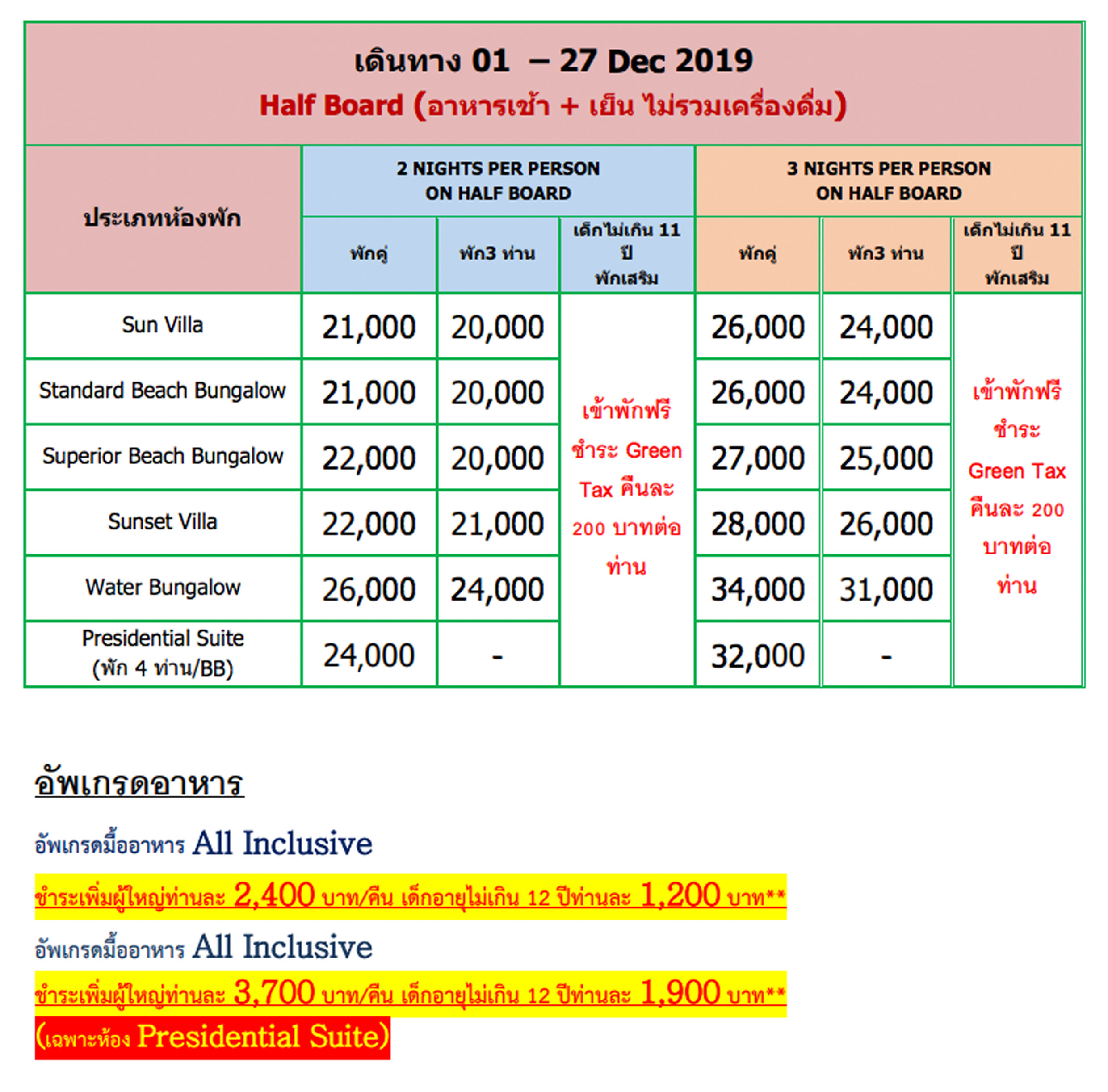 - อาหารเช้า เย็น ไม่รวมเครื่องดื่ม