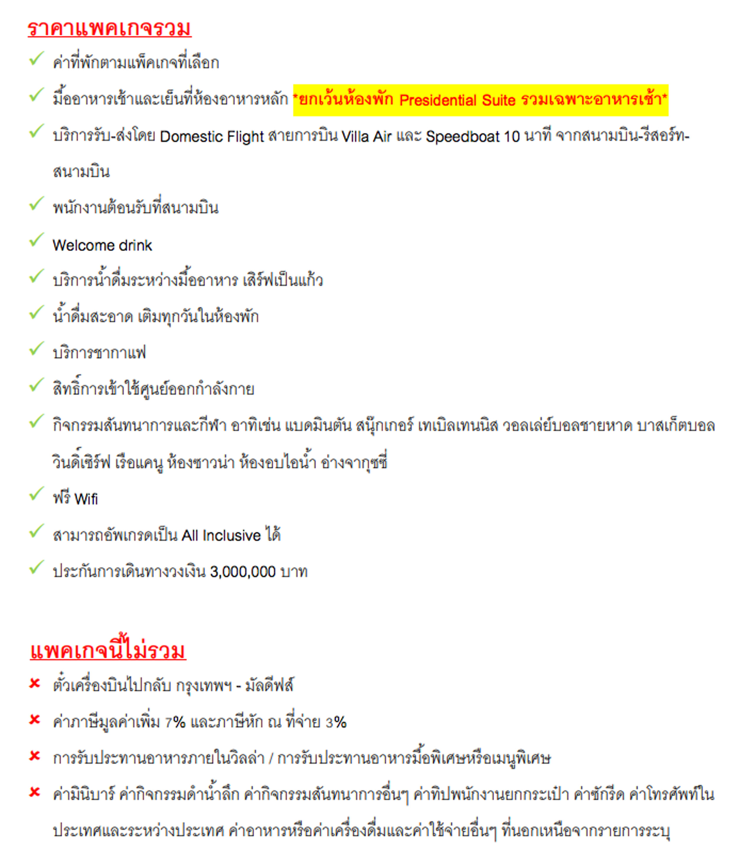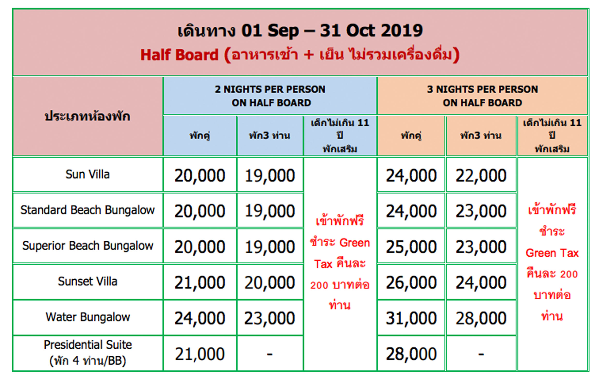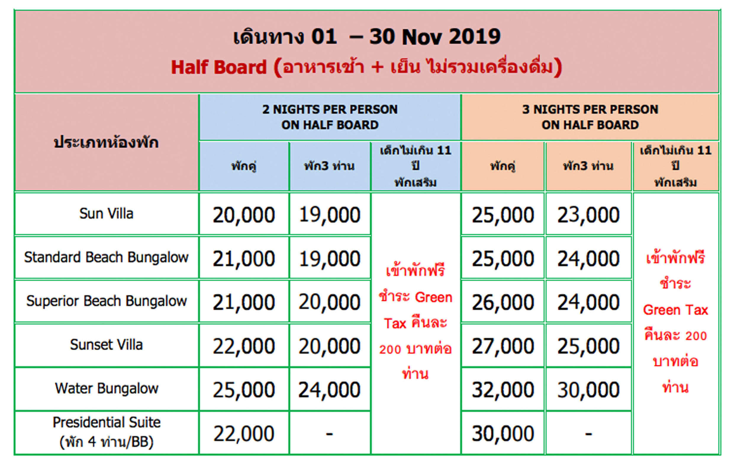 - อาหารเช้า เย็น ไม่รวมเครื่องดื่ม
