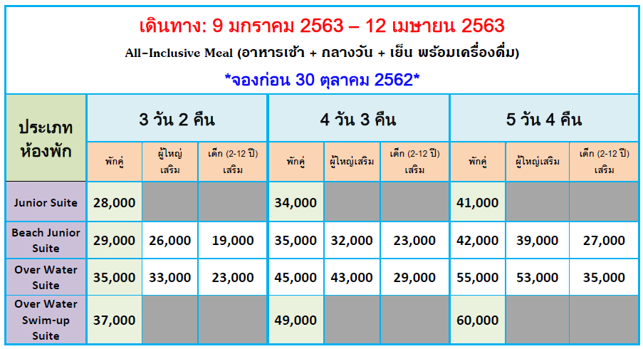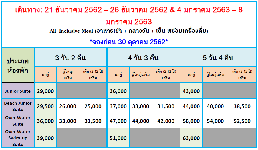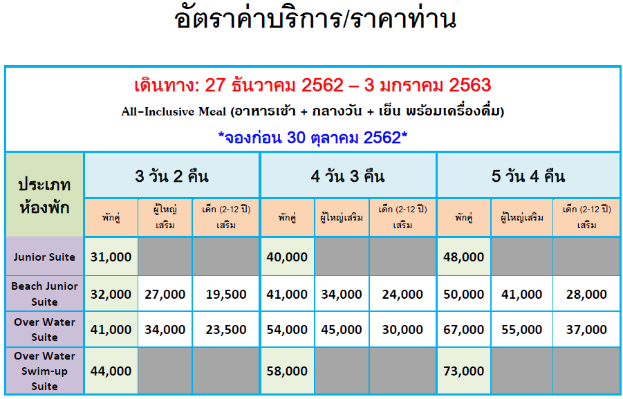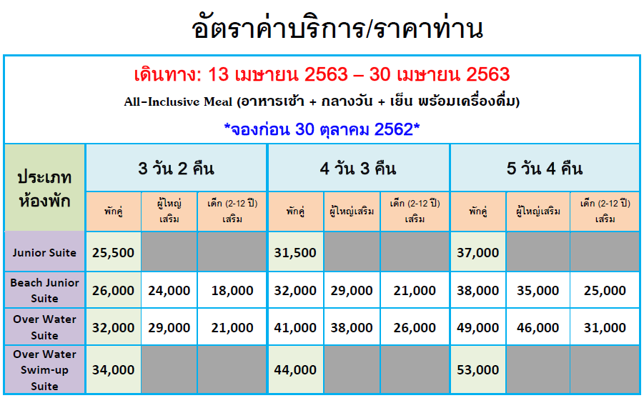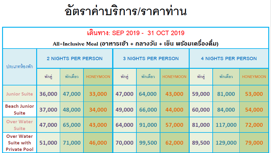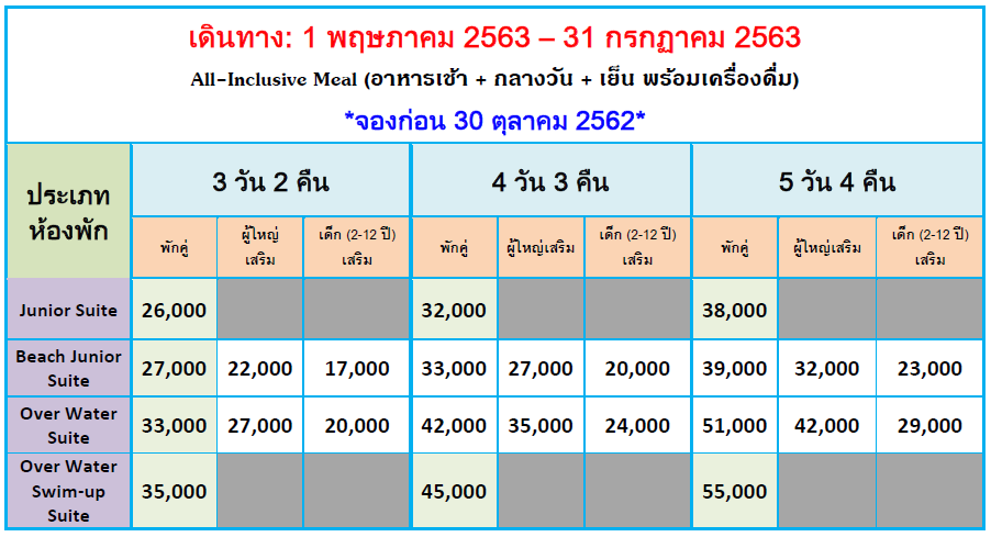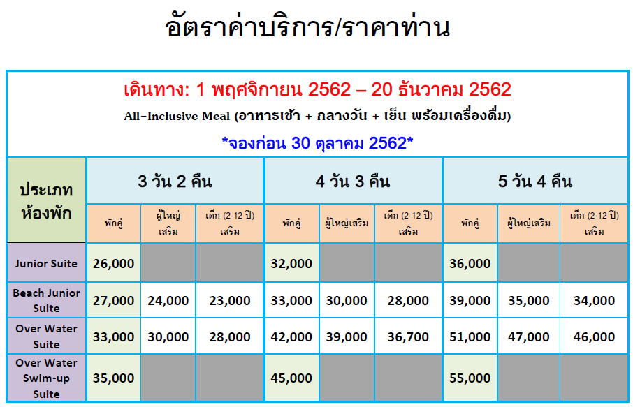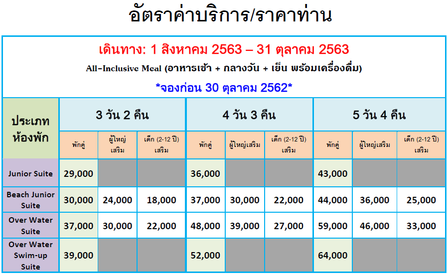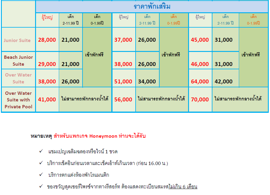 - Overwater Suite with private pool ตั้งอยู่เหนือน้ำและมีสระว่ายน้ำส่วนตัวได้รับการ ออกแบบเป็นพิเศษสำหรับผู้ที่ต้องการสัมผัสกับการเข้าพักที่หรูหราในทุกรายละเอียด