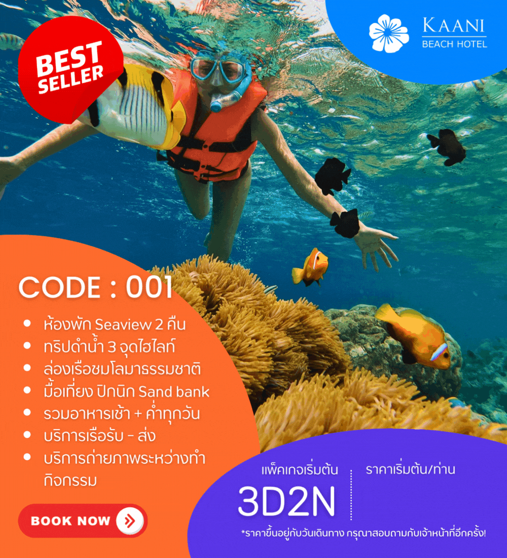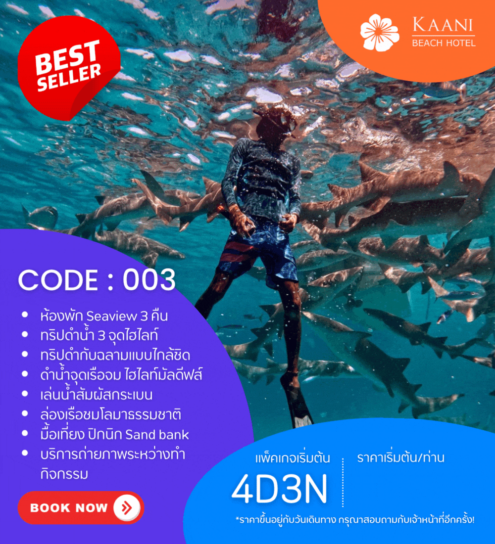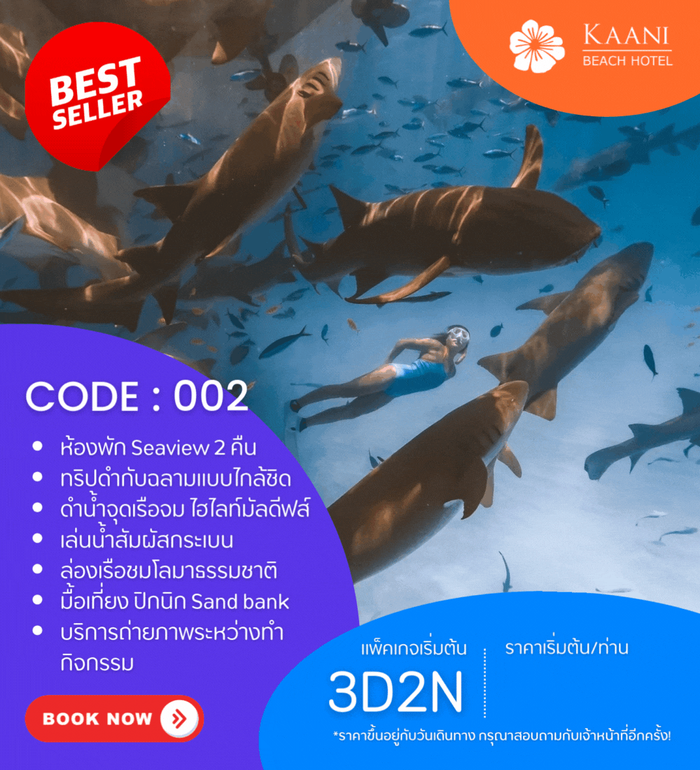 ✓ ทะเลสวย ชายหาดขาว น้ำใส และกิจกรรมทางน้ำครบ "ดำน้ำใกล้ชิดฉลาม" "เล่นน้ำคู่กระเบนแบบเอื้อมถึง" "ล่องเรือชมโลมาธรรมชาติ"