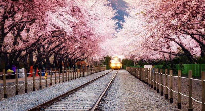 เทศกาลฤดูใบไม้ผลิคยองฮวา – Gyeonghwa Station เป็นหนึ่งในจุดชมซากุระที่สวยอันดับต้นๆของเกาหลีเลยก็ว่าได้ วิวอุโมงค์ดอกซากุระที่เรียงรายกันอยู่เต็มทั้งสองข้างทางนั้นมีความยาวประมาณ 800 เมตร จะบานพร้อมๆกัน ทำให้ผู้คนนิยมมาท่องเที่ยวถ่ายภาพขณะที่รถไฟกำลังวิ่งผ่าน ซึ่งจะมองเห็นวิวสวยๆ ของดอกซากุระเป็นฉากหลังด้วย นอกจากนี้ยังมีละครเกาหลีหลายเรื่องก็ใช้ทางรถไฟแห่งนี้เป็นฉากในการถ่ายทำ เช่น “Boy Goes to Heaven” (2005) และ “Spring Waltz” (2006)  สถานีรถไฟคยองฮวาแห่งนี้เป็นสถานีเล็กๆอยู่ที่เมืองจินแฮ (Jinhae) ได้มีการยกเลิกการใช้งานไปแล้วตั้งแต่ปี 2015 แต่จะเปิดให้รถไฟวิ่งเฉพาะในช่วงเทศกาล Jinhae Gunhangje Festival ซึ่งเป็นเทศกาลชมดอกซากุระที่จัดอย่างยิ่งใหญ่ ที่นี่เป็นเทศกาลดอกซากุระที่ ใหญ่ที่สุดในประเทศ และต้นซากุระที่นี่ เป็นต้นซากุระที่มาจากประเทศญี่ปุ่นอีกด้วย เพราะช่วงที่ญี่ปุ่นยึดครองเกาหลีในสมัยอดีตกาลนั้น ได้นำต้นซากุระของบ้านตัวเองมาปลูกไว้ที่นี่นับหมื่นต้น ใครจะรู้เล่าว่า กาลเวลาผ่านไป จินแฮ จะเป็นสถานที่ที่มีซากุระ “สวยที่สุดในประเทศ”