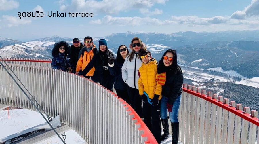 มาถึงจุดชมวิวที่ต้องนั่งกระเช้า Unkai Gondola ขึ้นมา จะมองเห็นเทือกเขาทั้งลูกถูกปกคลุมไปด้วยหิมะสีขาวและต้นไม้ที่กลายเป็นน้ำแข็ง ส่วนบริเวณด้านบนจะเป็นทางเดินให้เดินชมวิวได้ มีระเบียงลอยฟ้า แถมยังได้ใกล้ชิดกับธรรมชาติมากขึ้นอีกด้