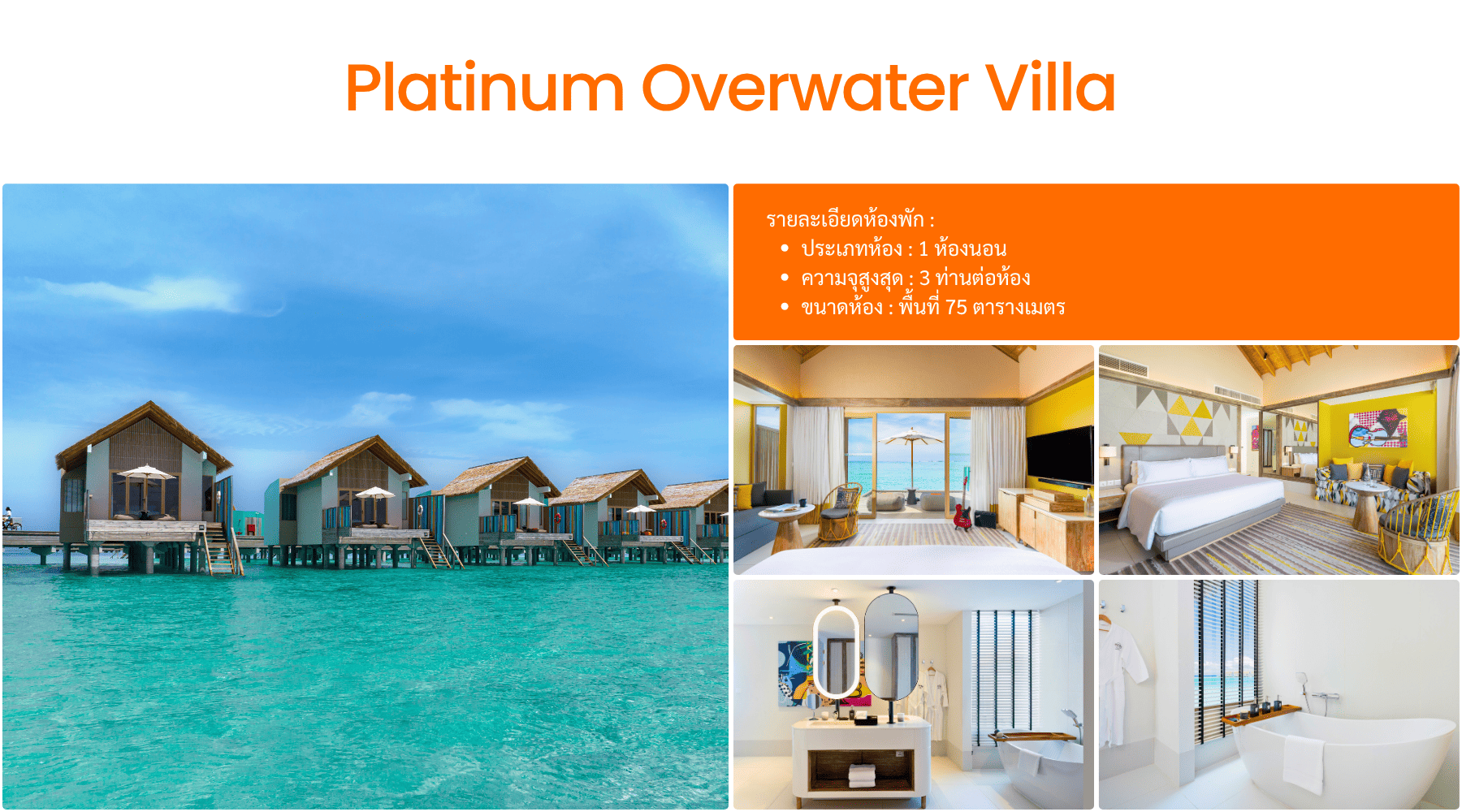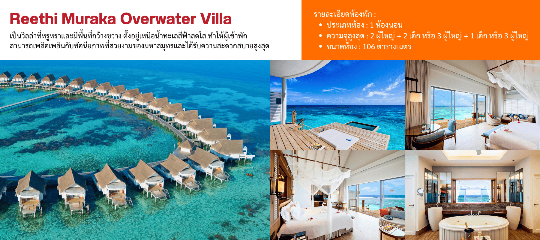 - ราคาข้างต้นคำนวณจากอัตราภาษีของประเทศมัลดีฟส์ ณ อัตราปัจจุบัน (GST และ ภาษีอื่นๆ) หากมีการเปลี่ยนแปลงอัตราภาษีต่างๆ ของประเทศมัลดีฟส์ ณ ช่วงเวลาที่ทำการจอง บริษัทฯ ขอสงวนสิทธิ์ในการเปลี่ยนแปลงราคา