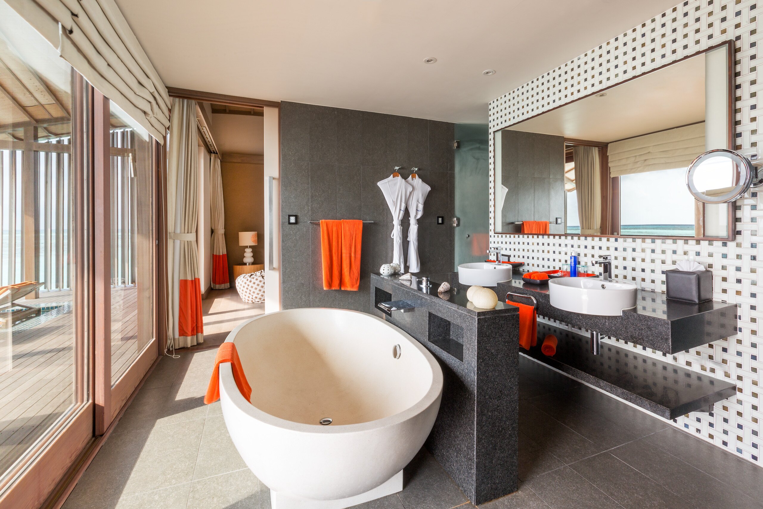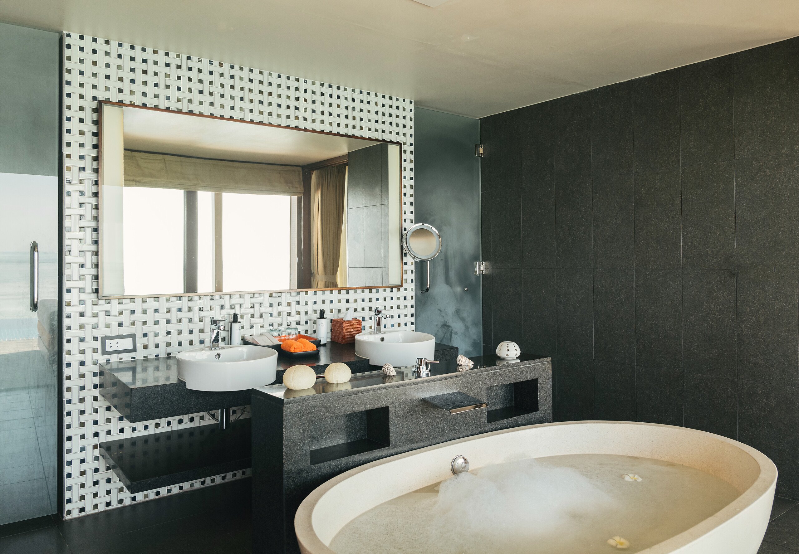 - ห้องน้ำที่กว้างขวางพร้อมอ่างอาบน้ำและฝักบัวเรนชาวเวอร์ มีหน้าต่างที่สามารถมองเห็นวิวทะเล