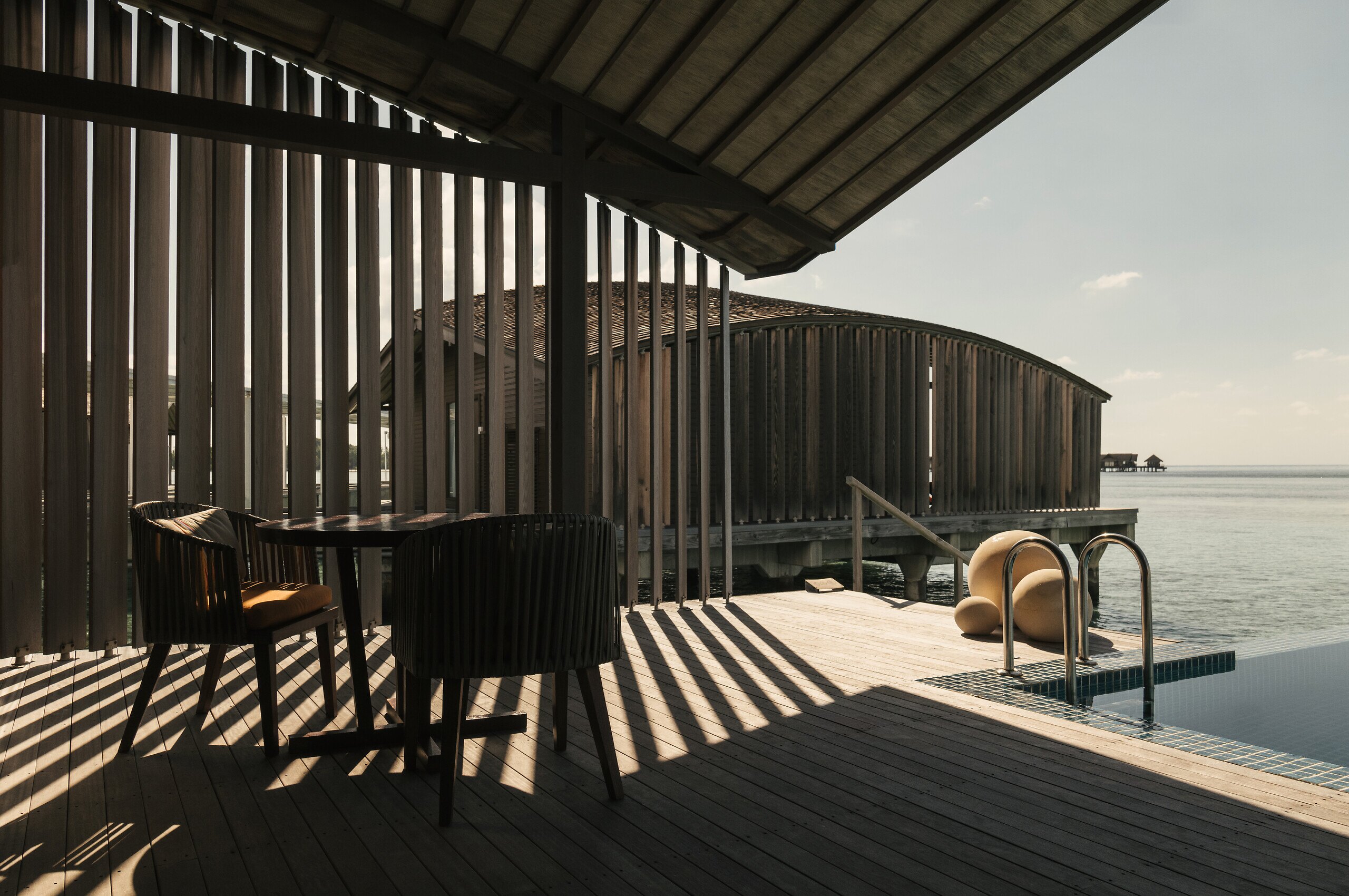 - มีระเบียงส่วนตัวที่มองเห็นวิวทะเลและพระอาทิตย์ตก พร้อมกับที่นั่งพักผ่อนและบันไดลงสู่ทะเลโดยตรง