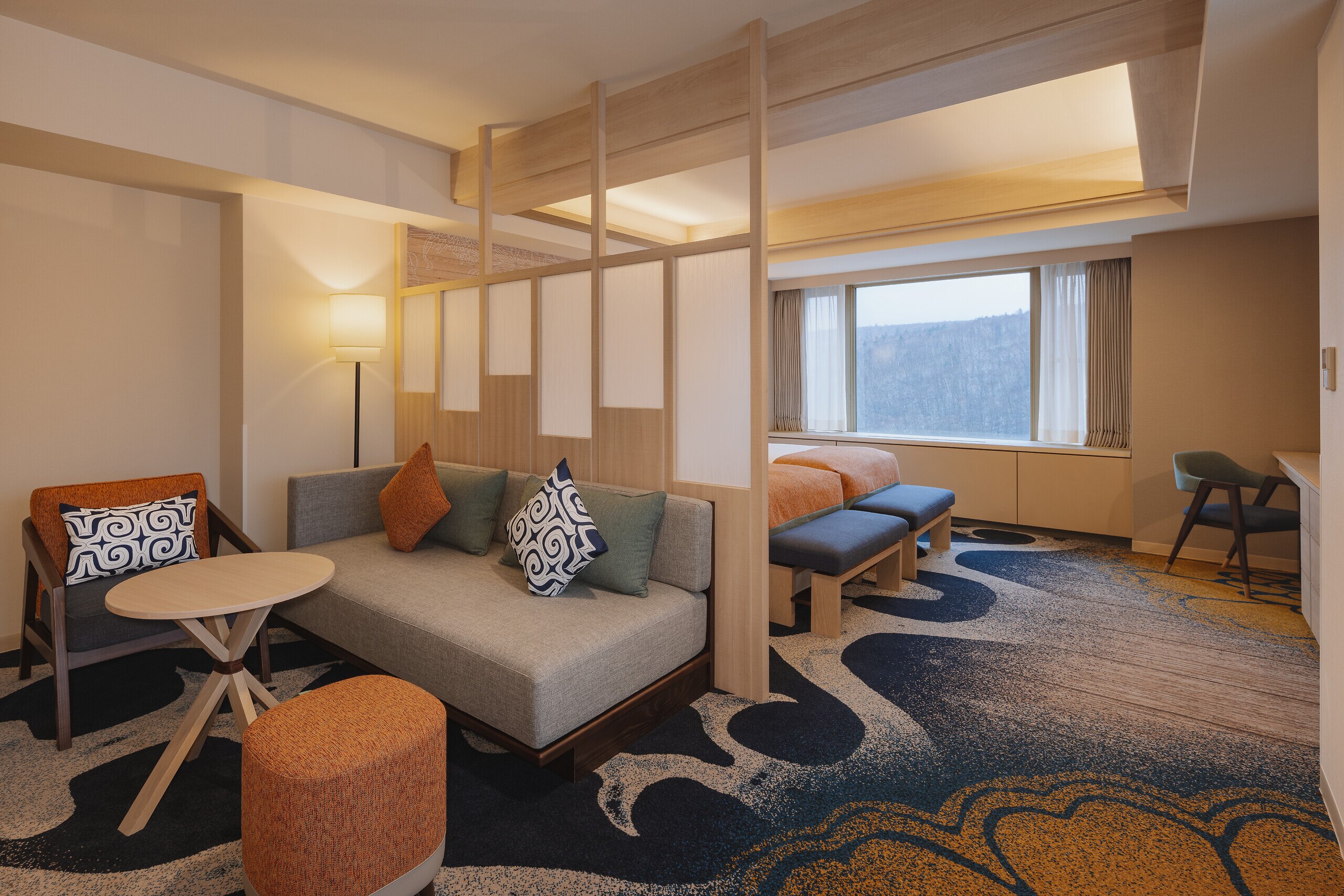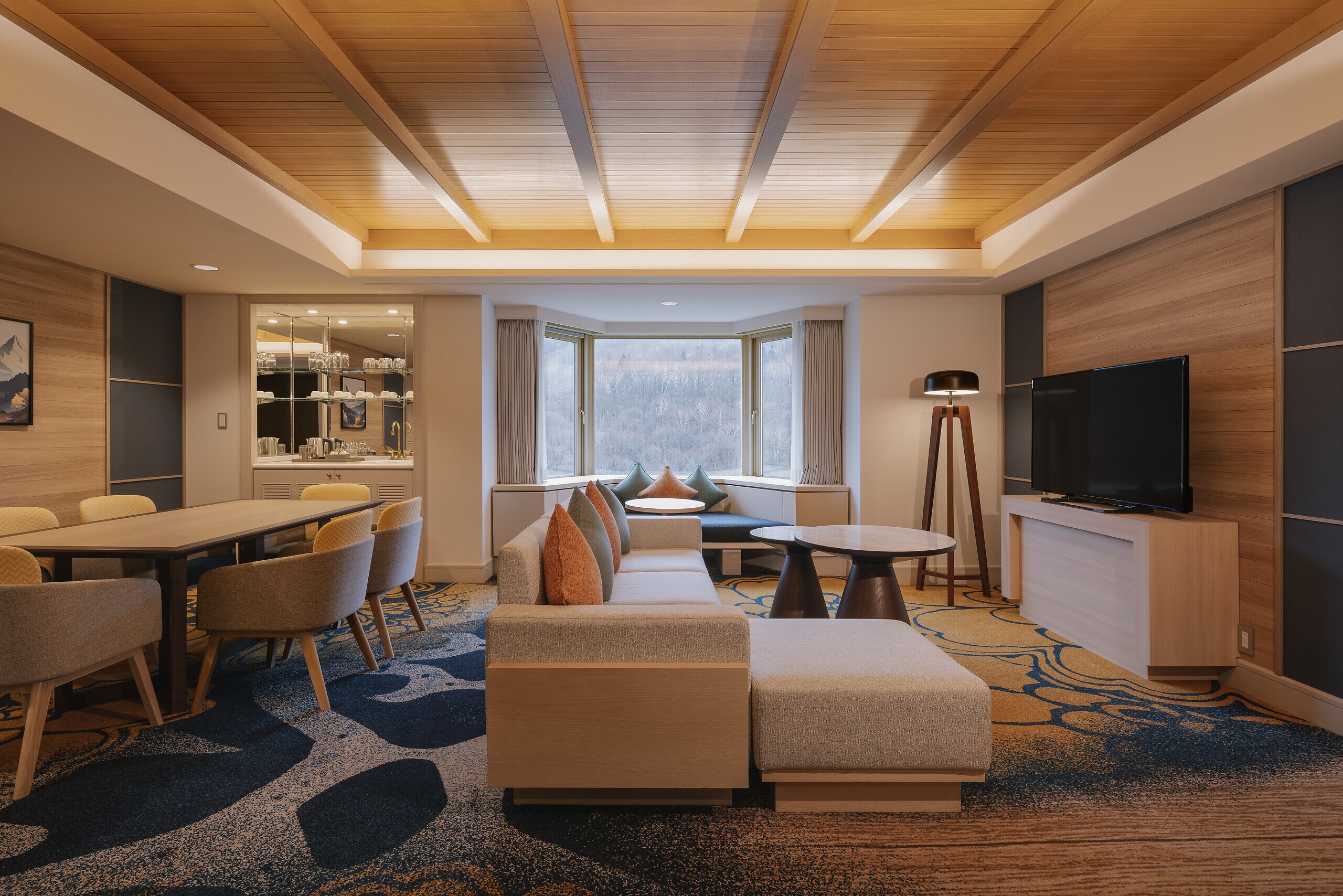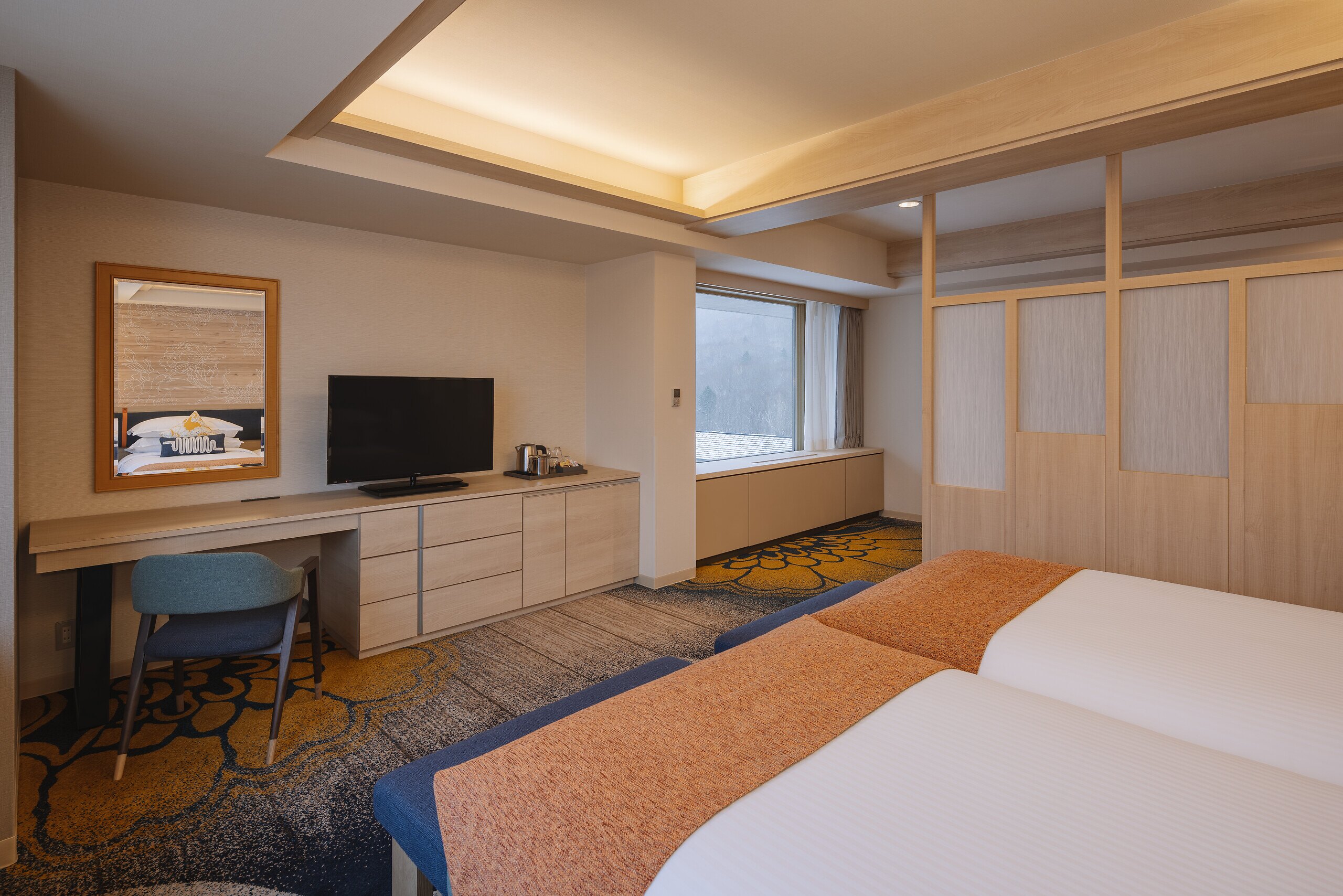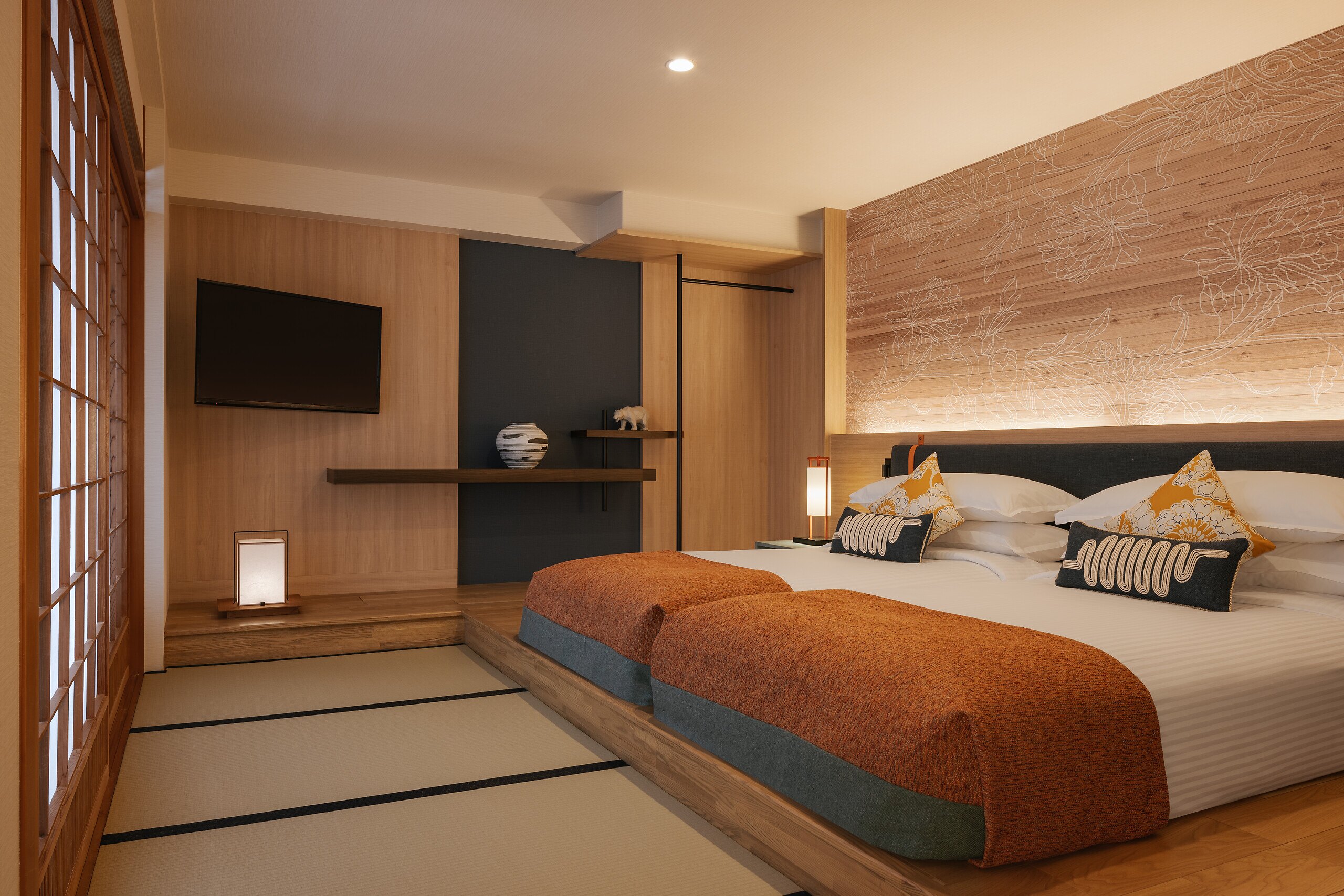 การตกแต่ง : การตกแต่งสไตล์ญี่ปุ่นที่ร่วมสมัย ซึ่งมีการใช้วัสดุธรรมชาติและการออกแบบที่เรียบง่ายแต่หรูหรา