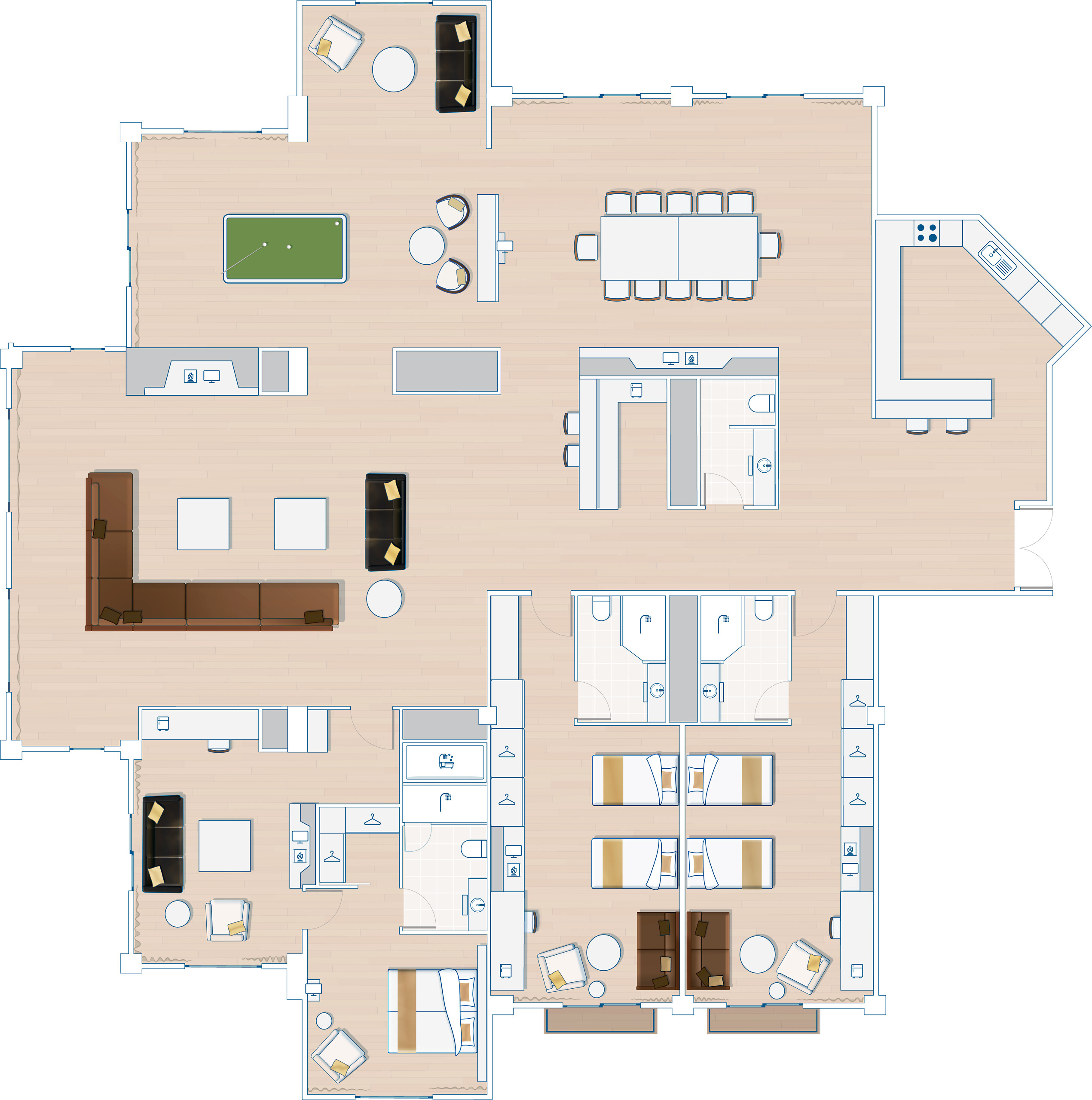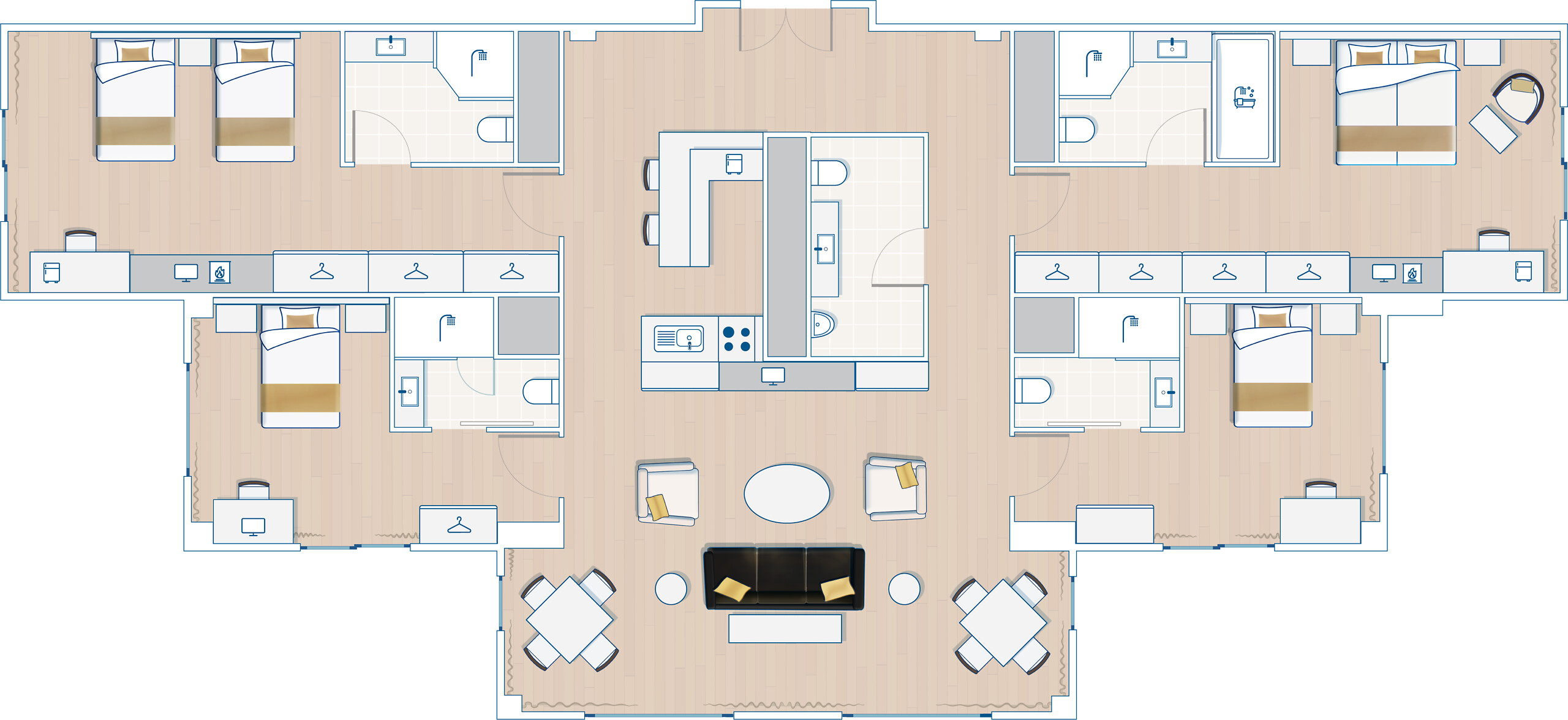 - Suite ห้องสวีทที่มีขนาดใหญ่ และหรูหรา เหมาะสำหรับครอบครัว มีห้องนั่งเล่นแยกจากห้องนอนและมองเห็นวิวที่สวยงามของธรรมชาติ