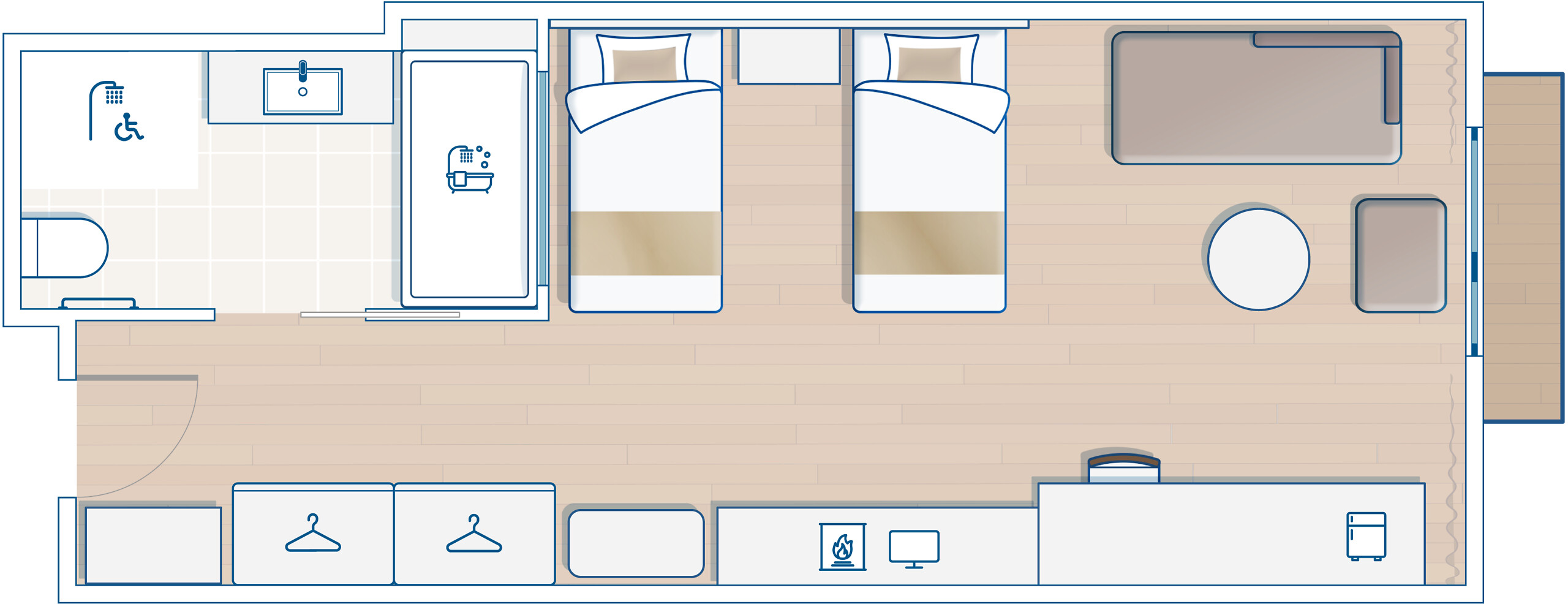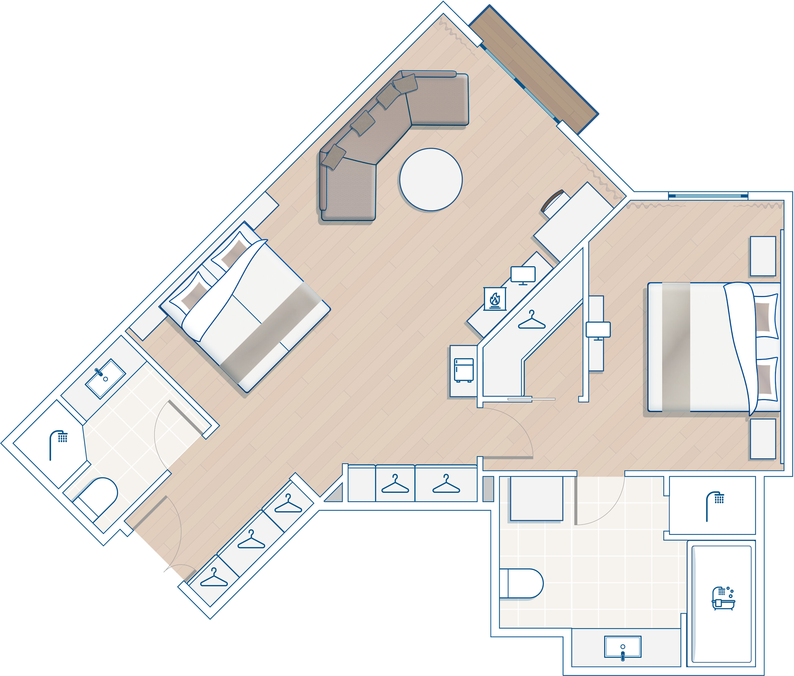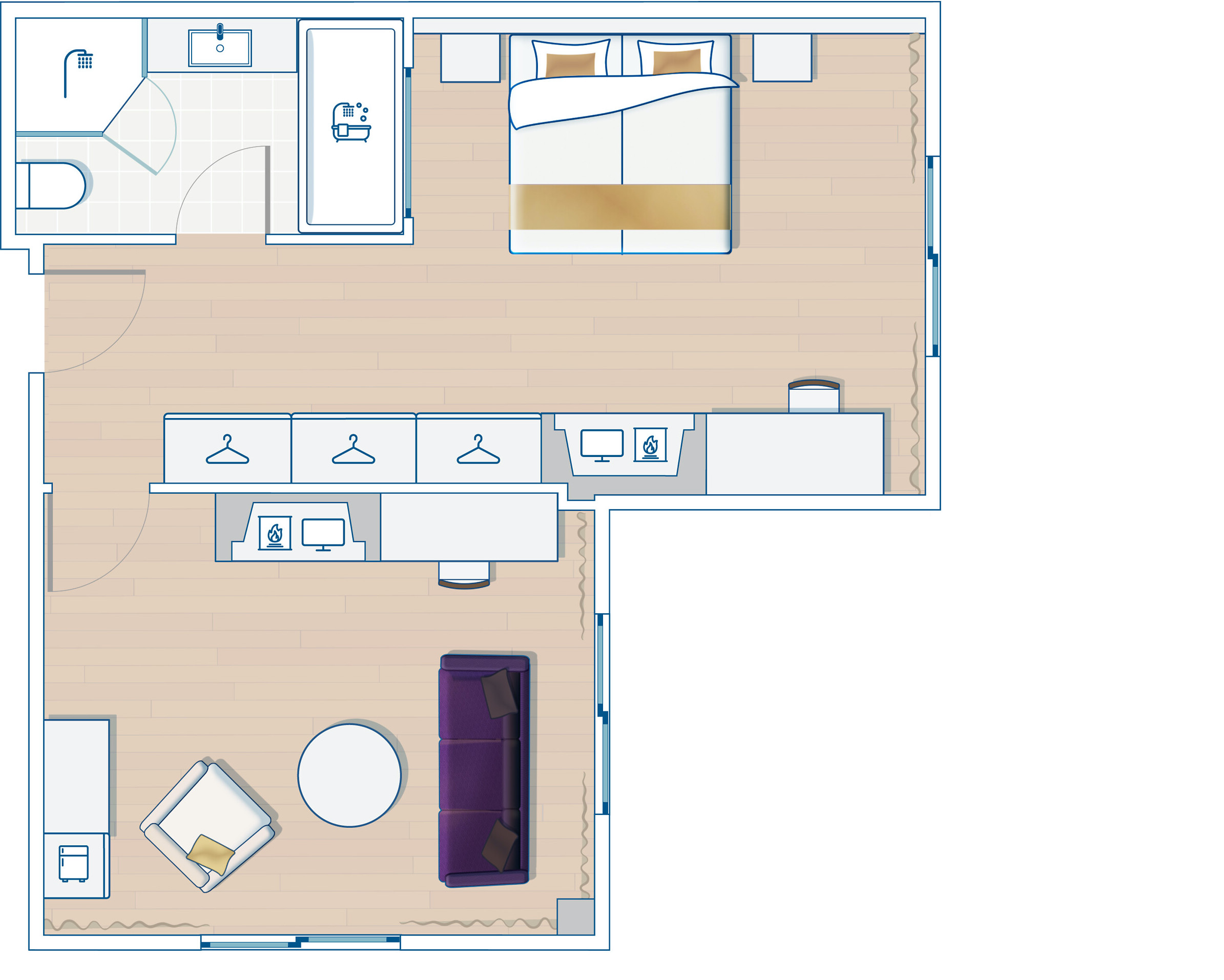 - Deluxe Room ห้องพักที่ใหญ่ขึ้นและมีสิ่งอำนวยความสะดวกเพิ่มเติม เช่น โซฟาเบดและพื้นที่นั่งเล่นที่แยกต่างหาก