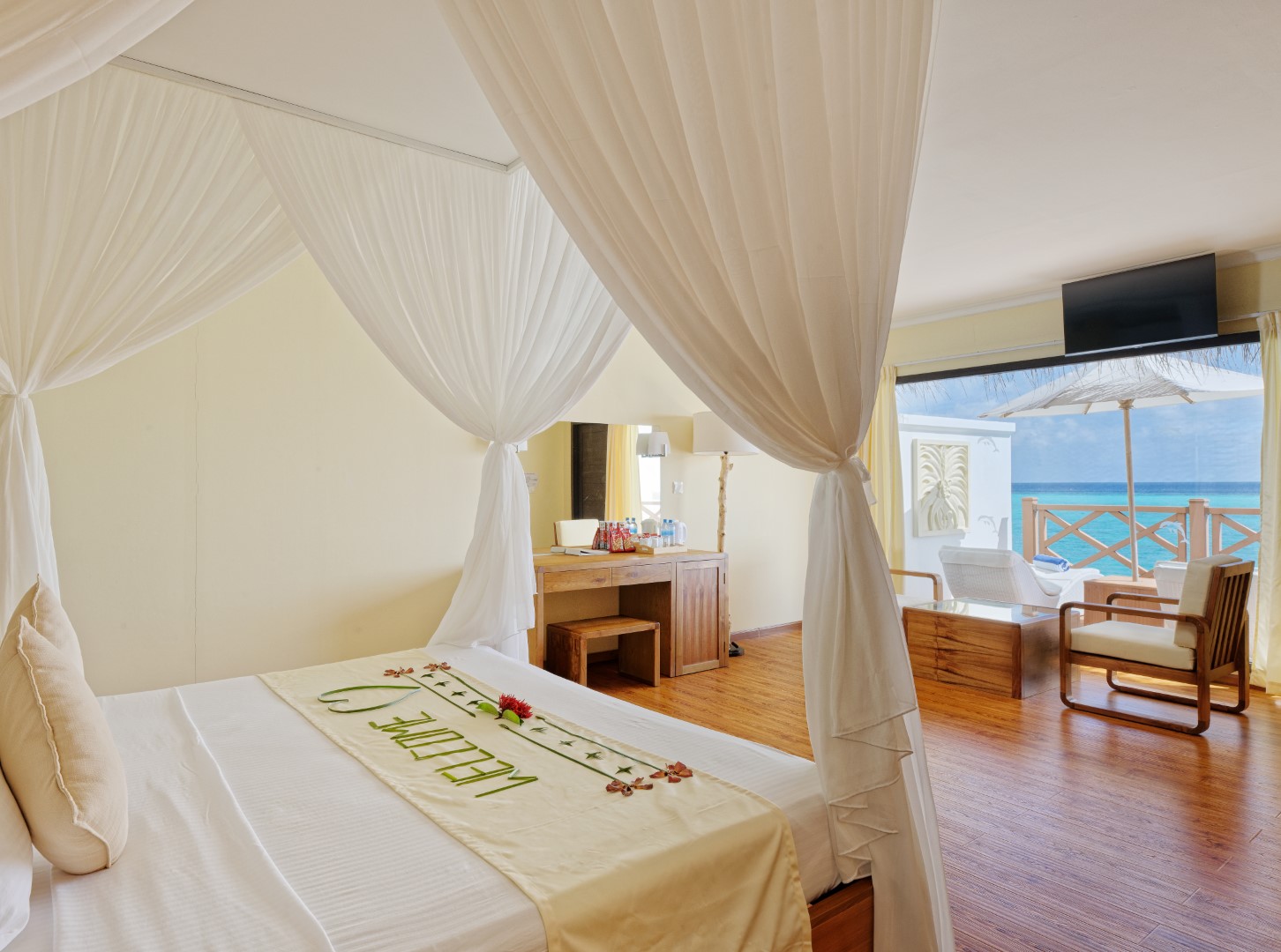 ห้องพักของ Angaga Island Resort ออกแบบในสไตล์เรียบง่าย อบอุ่น และกลมกลืนกับธรรมชาติ เน้นการใช้ไม้และโทนสีสบายตา ให้บรรยากาศผ่อนคลายแบบเกาะส่วนตัวอย่างแท้จริง