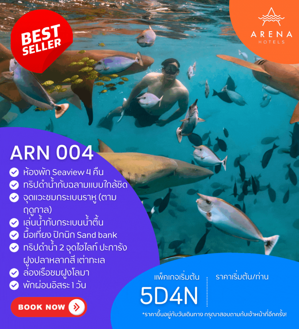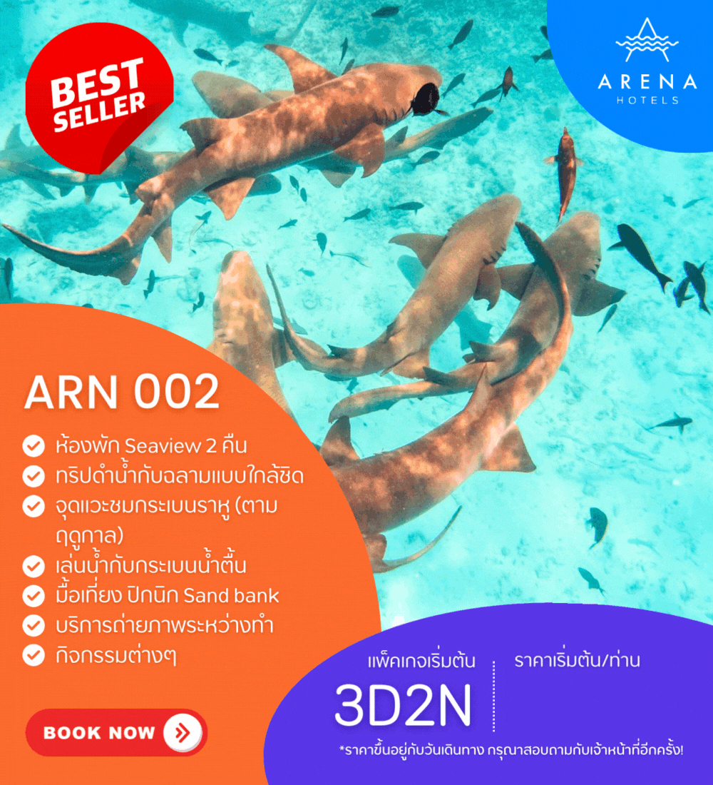 ✓ พักกลางน้ำรีสอร์ท 5 ดาว แบบ All-Inclusive อาหารและเครื่องดื่มไม่อั้น!✓ พักเกาะท้องถิ่น Arena Beach Hotel ทำกิจกรรมดำน้ำกับฉลาม เล่นน้ำกับกระเบน