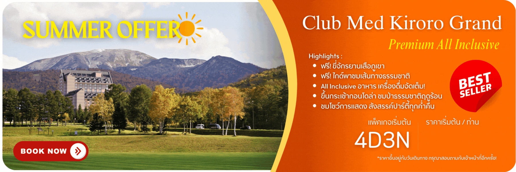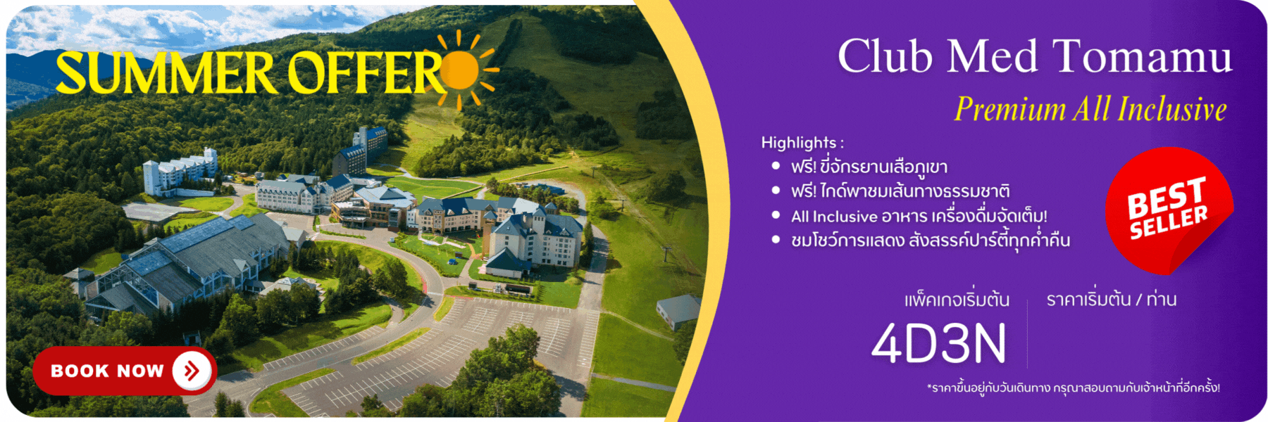 รวมรีสอร์ทฤดูร้อนที่ดีที่สุดในฮอกไกโดกับ Club Med แพ็คเกจสุดคุ้ม! ค้นพบสุดยอดรีสอร์ทฤดูร้อนในฮอกไกโด กับ Club Med! พักผ่อนในบรรยากาศหรูหรา ท่ามกลางธรรมชาติสวยงาม ที่เปิดให้บริการทั้งในช่วงฤดูหนาวและฤดูร้อน โดยในช่วงฤดูร้อนจะมีการจัดกิจกรรมกลางแจ้งหลากหลาย เช่น เดินป่า ปั่นจักรยานเสือภูเขา ขึ้นกระเช้ากอนโดล่า เรามีแพ็คเกจ "All-Inclusive" ที่ให้คุณเพลิดเพลินแบบไร้กังวล รวมอาหารทุกมื้อ เครื่องดื่มไม่อั้น กิจกรรมมากมาย และความบันเทิงรวมอยู่ในราคาเดียว!