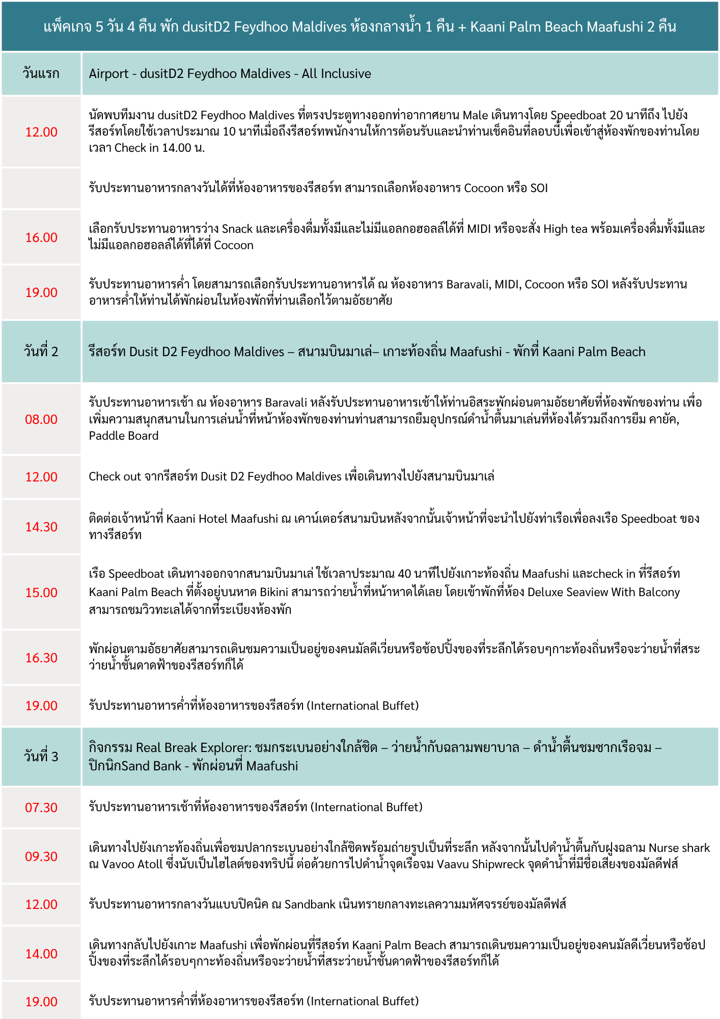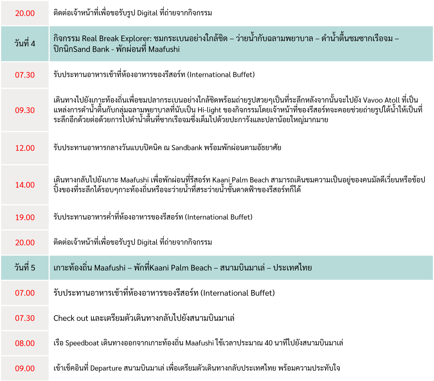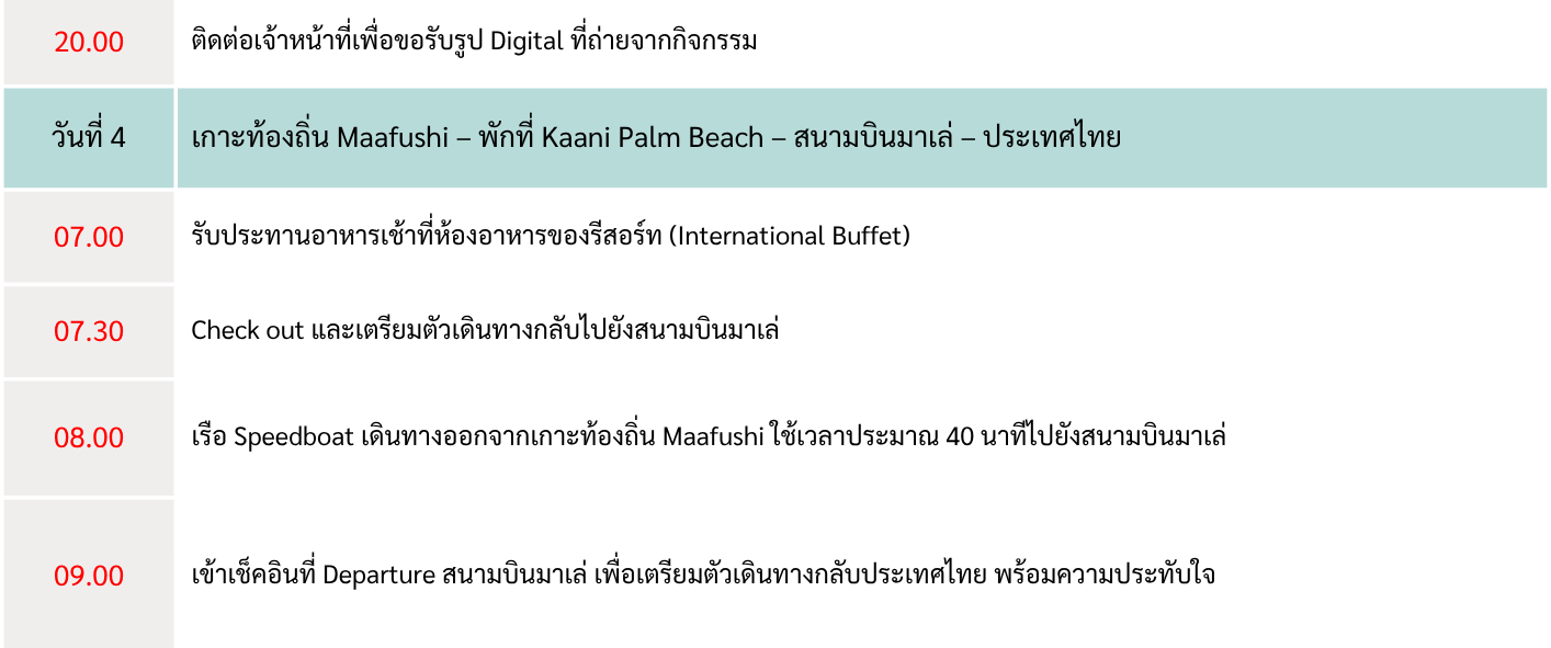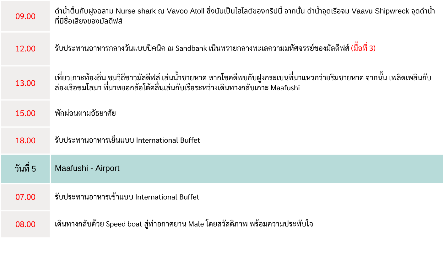 - 08:00 | เดินทางกลับด้วย Speedboat 40 นาที สู่ท่าอกาศยาน Male โดยสวัสดิภาพ พร้อมความประทับใจ