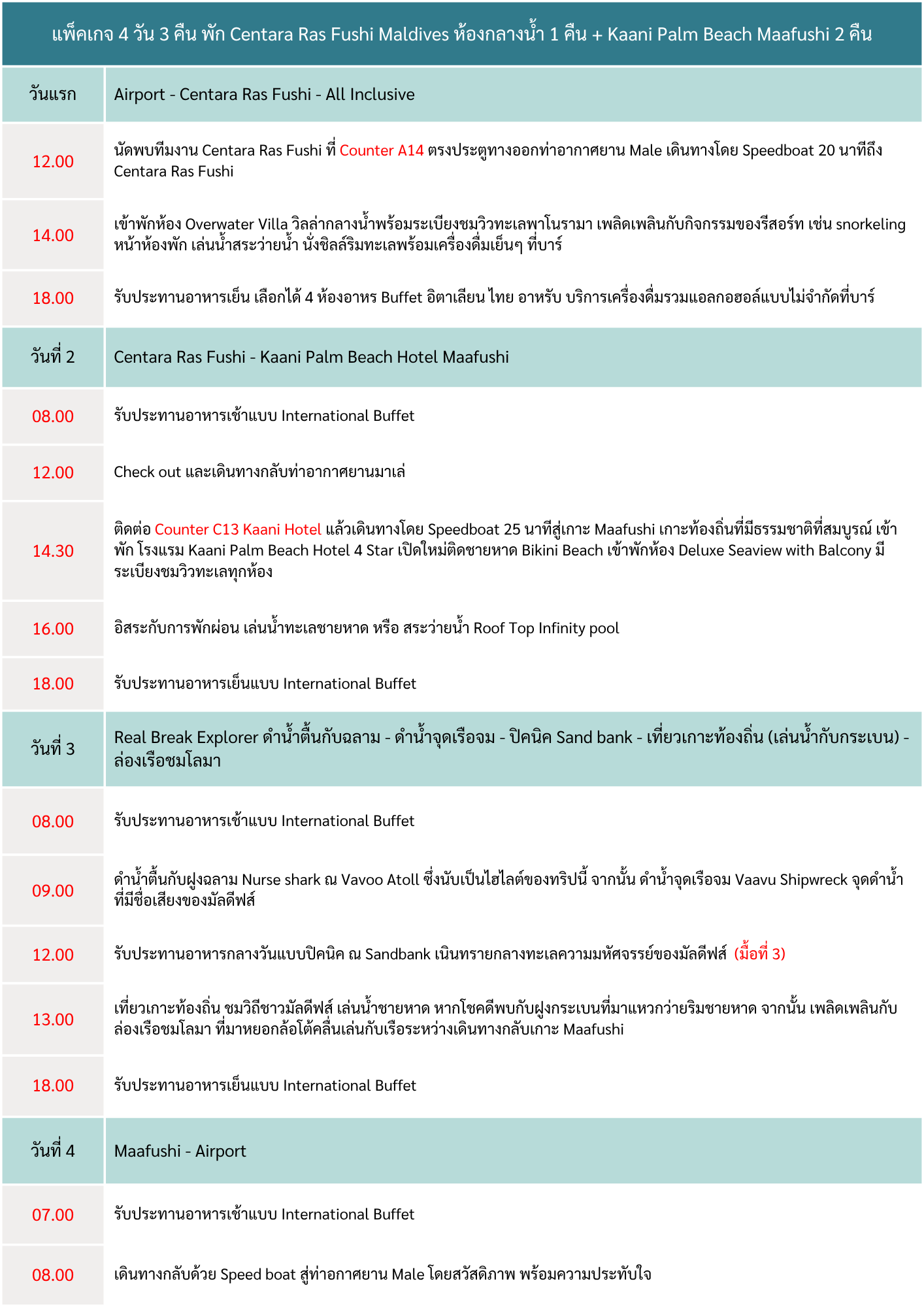 - 14:30 | Centara ที่ Counter A14 ตรงประตูทางออกท่าอากาศยาน Male เดินทางโดย Speedboat 40 นาทีถึง Centara Mirage Lagoon Maldivs