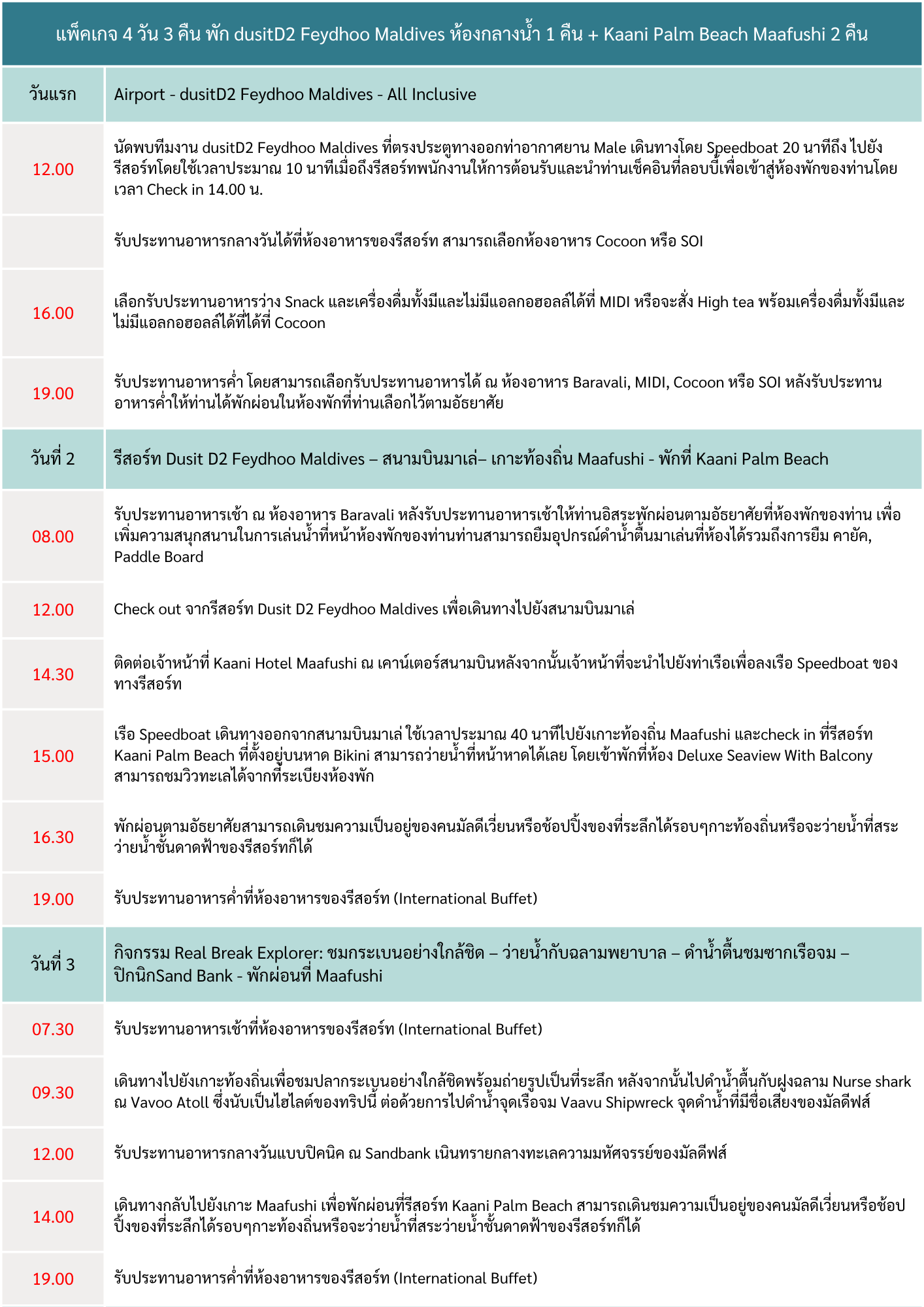 - 08:00 | เดินทางกลับด้วย Speedboat 40 นาที สู่ท่าอกาศยาน Male โดยสวัสดิภาพ พร้อมความประทับใจ