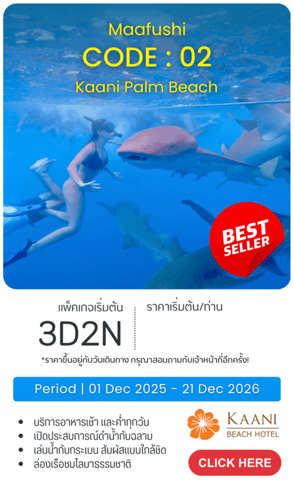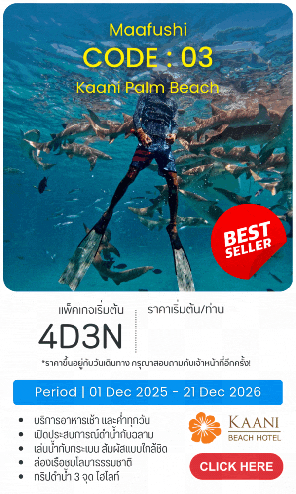 - 14:30 | ติดต่อ Counter C13 Kaani Hotel แล้วเดินทางโดย Speedboat 25 นาทีสู่เกาะ Maafushi เกาะท้องถิ่นที่มีธรรมชาติที่สมบูรณ์ เข้าพัก โรงแรม Kaani Palm Beach Hotel 4 Star เปิดใหม่ติดชายหาด Bikini Beach เข้าพักห้อง Deluxe Seaview with Balcony มีระเบียงชมวิวทะเลทุกห้อง
