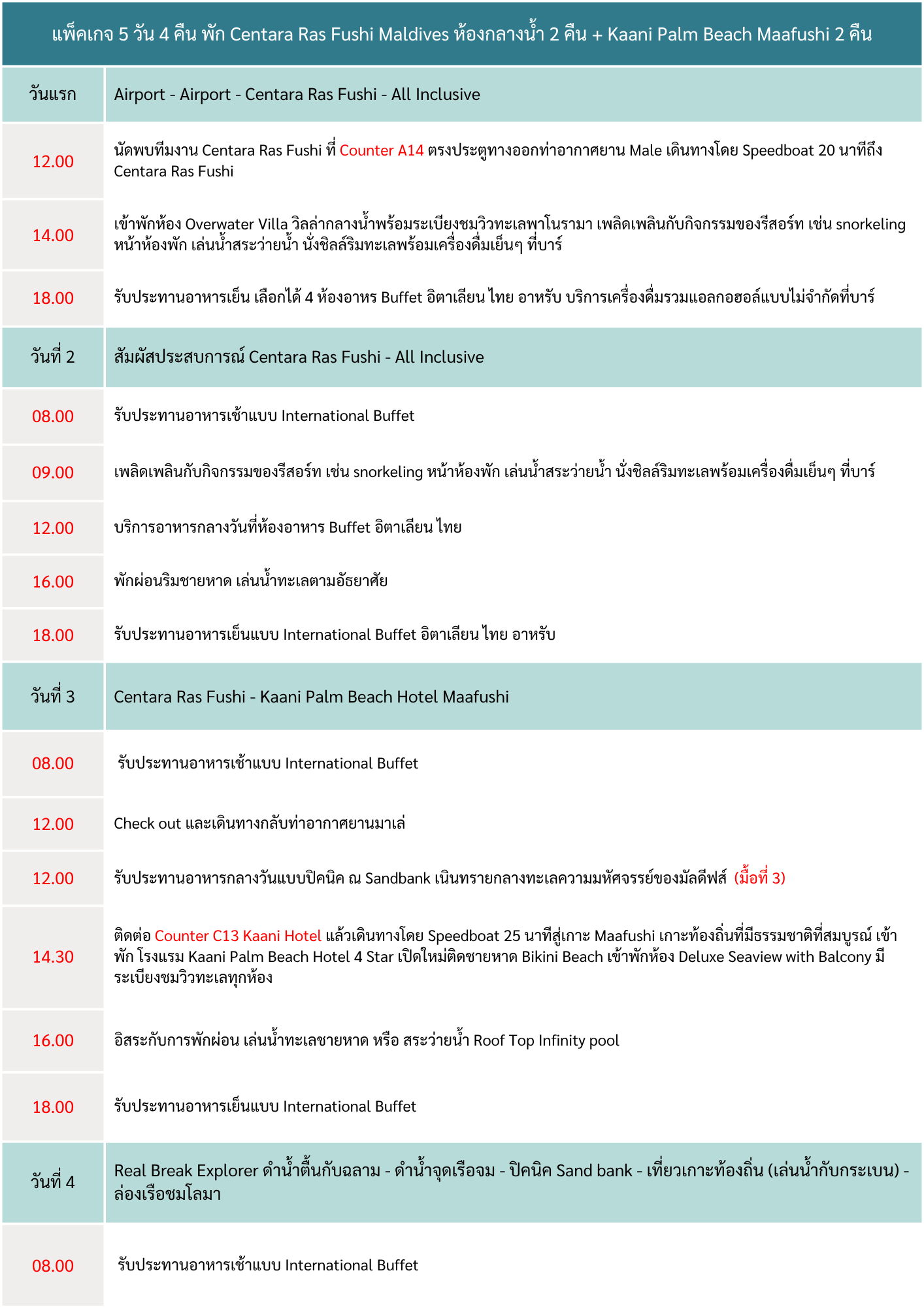 - 14:30 | Centara ที่ Counter A14 ตรงประตูทางออกท่าอากาศยาน Male เดินทางโดย Speedboat 40 นาทีถึง Centara Mirage Lagoon Maldivs